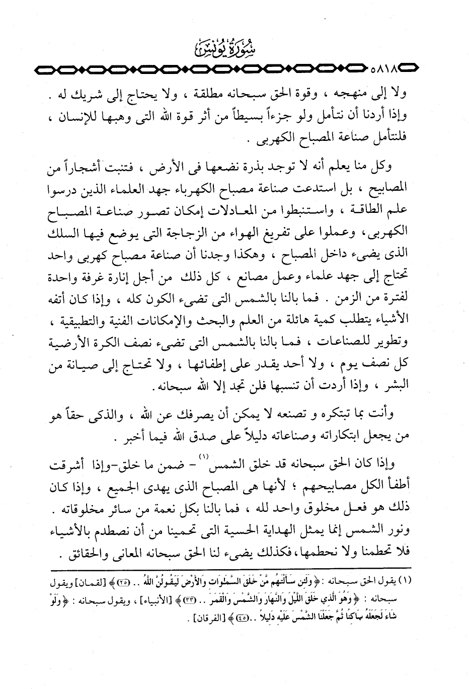 وكل منا يعلم أنه لا توجد بذرة نضعها في الأرض، فتنبت أشجاراً من المصابيح، بل استدعت صناعة مصباح الكهرباء جهد العلماء الذين درسوا علما الطاقة، واستنبطوا من المعادلات إمكان تصور صناعة المصباح الكهربي، وعملوا على تفريغ الهواء من الزجاجة التي يوضع فيها السلك الذي يضيء داخل المصباح، وهكذا وجدنا أن صناعة مصباح كهربي واحد تحتاج إلى جهد علماء وعمل مصانع، كل ذلك من أجل إنارة غرفة واحدة لفترة من الزمن. فما بالنا بالشمس التي تضيء الكون كله، وإذا كان أتفه الأشياء يتطلب كمية هائلة من العلم والبحث والإمكانات الفنية والتطبيقية، وتطوير للصناعات، فما بالنا بالشمس التي تضيء نصف الكرة الأرضية كل نصف يوم، ولا أحد يقدر على إطفائها، ولا تحتاج إلى صيانة من البشر، وإذا أردت أن تنسبها فلن تجد إلا الله سبحانه.