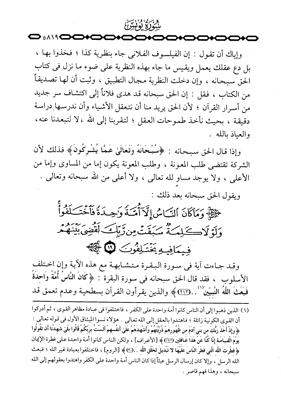 وقد جاءت آية في سورة البقرة متشابهة مع هذه الآية وإن اختلف الأسلوب، فقد قال الحق سبحانه في سورة البقرة: {كَانَ الناس أُمَّةً وَاحِدَةً فَبَعَثَ الله النبيين} [البقرة: 213] والذين يقرأون القرآن بسطحية وعدم تعمق قد