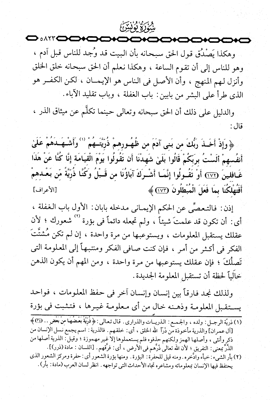 {وَإِذْ أَخَذَ رَبُّكَ مِن بنيءَادَمَ مِن ظُهُورِهِمْ ذُرِّيَّتَهُمْ وَأَشْهَدَهُمْ على أَنفُسِهِمْ أَلَسْتُ بِرَبِّكُمْ قَالُواْ بلى شَهِدْنَآ أَن تَقُولُواْ يَوْمَ القيامة إِنَّا كُنَّا عَنْ هذا غَافِلِينَ أَوْ تقولوا إِنَّمَآ أَشْرَكَ آبَاؤُنَا مِن قَبْلُ وَكُنَّا ذُرِّيَّةً مِّن بَعْدِهِمْ أَفَتُهْلِكُنَا بِمَا فَعَلَ المبطلون} [الأعراف: 172173]