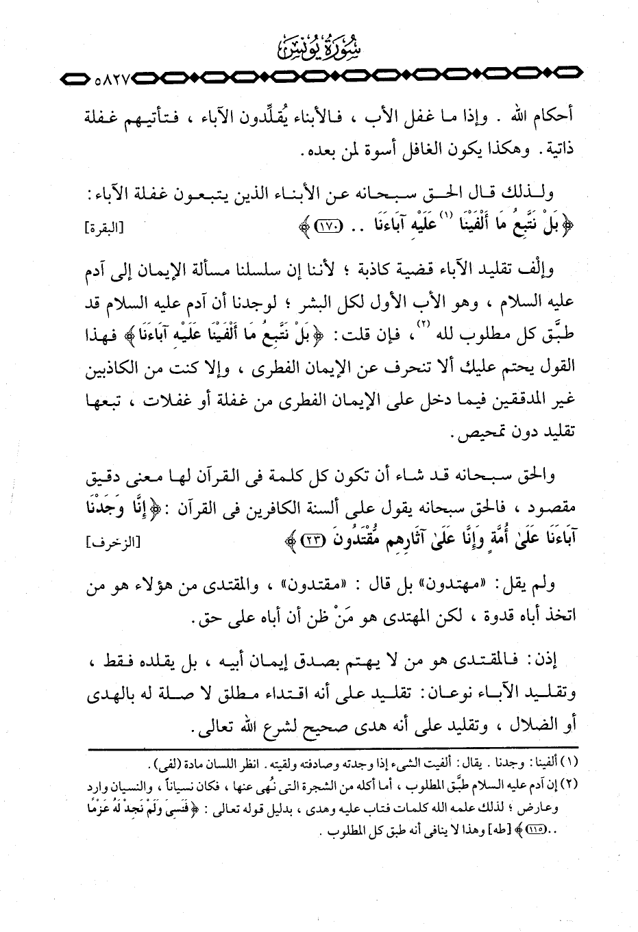 إذن: فالمقتدي هو من لا يهتم بصدق إيمان أبيه، بل يقلده فقط، وتقليد الآباء نوعان: تقليد على أنه اقتداء مطلق لا صلة له بالهدى أو الضلال، وتقليد على أنه هدى صحيح لشرع الله تعالى.