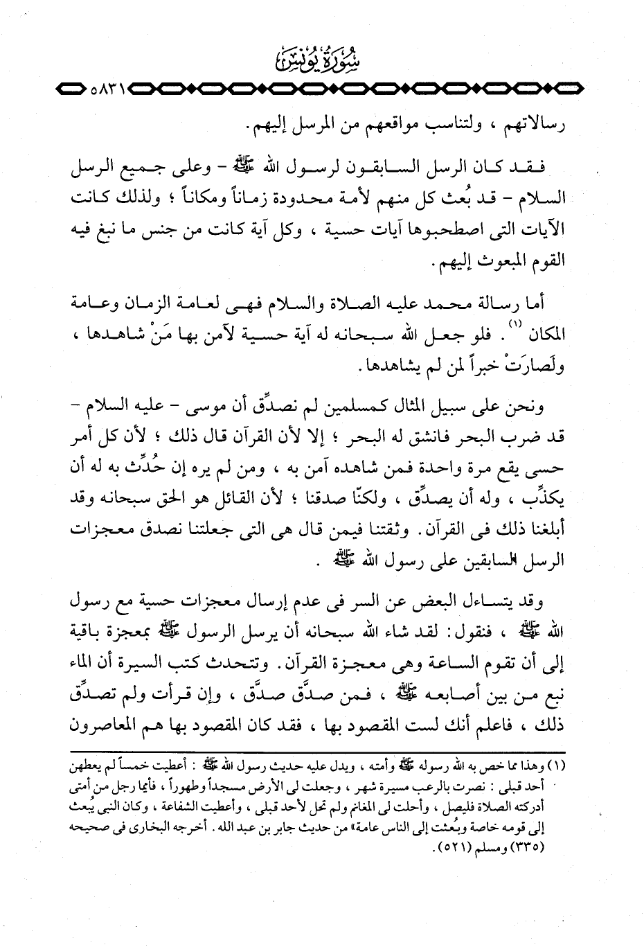 أما رسالة محمد عَلَيْهِ الصَّلَاة وَالسَّلَام ُ فهي لعامة الزمان وعامة المكان. فلو جعل الله سبحانه له آية حسية لآمن بها مَنْ شاهدها، ولَصارَتْ خبراً لمن يشاهدها.