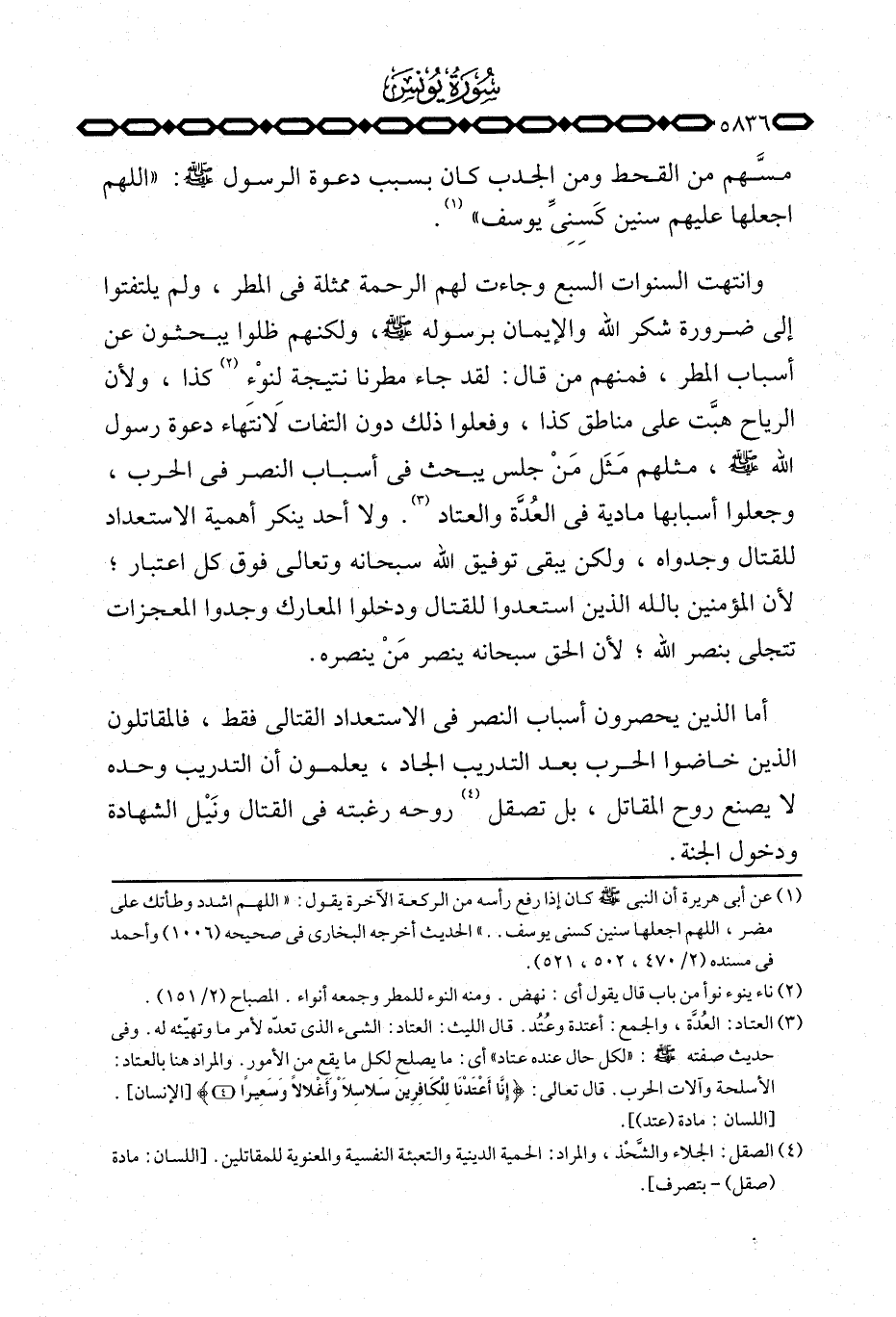 وانتهت السنوات السبع وجاء لهم الرحمة ممثلة في المطر، ولم يلتفتوا إلى ضرورة شكر الله والإيمان برسوله صَلَّى اللَّهُ عَلَيْهِ وَسَلَّم َ، ولكنهم ظلوا يبحثون عن أسباب المطر، فمنهم من قال: لقد جاء مطرنا نتيجة لِنوْءِ كذا، ولأن الرياح هبَّت على مناطق كذا، وفعلوا ذلك دون التفات لانتهاء دعوة رسول الله صَلَّى اللَّهُ عَلَيْهِ وَسَلَّم َ، مثلهم مَثَل مَنْ جلس يبحث في أسباب النصر في الحرب، وجعلوا أسبابها مادية في العُدَّة والعتاد، ولا أحد ينكر أهمية الاستعداد للقتال وجدواه، ولكن يبقى توفيق الله سبحانه وتعالى فوق كل اعتبار؛ لأن المؤمنين بالله الذين استعدوا للقتال ودخلوا المعارك وجدوا المعجزات تتجلى بنصر الله؛ لأن الحق سبحانه ينصر مَنْ ينصره.