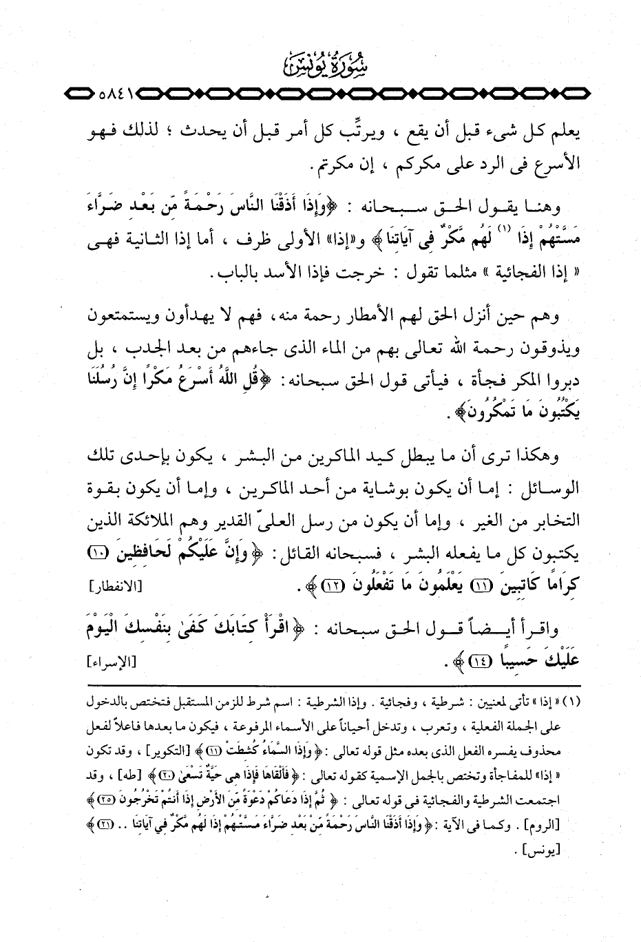 وهناك يقول الحق سبحانه: {وَإِذَآ أَذَقْنَا الناس رَحْمَةً مِّن بَعْدِ ضَرَّآءَ مَسَّتْهُمْ إِذَا لَهُمْ مَّكْرٌ في آيَاتِنَا} و «إذا» الأولى ظرف، أما إذا الثانية فهي «إذا الفجائية» مثلما تقول: خرجت فإذا الأسد بالباب.