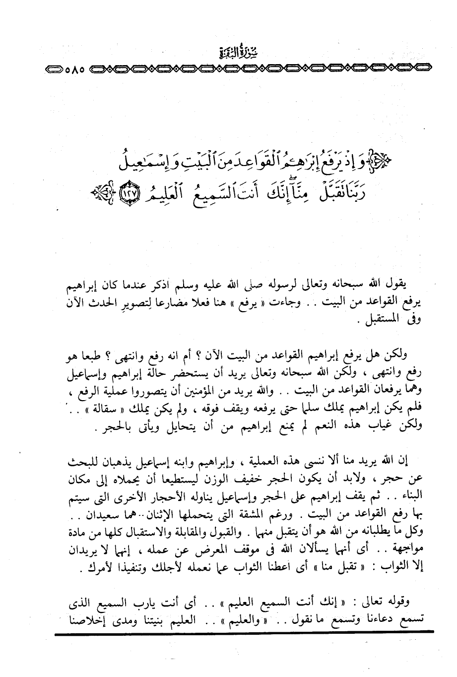 إن الله يريد منا ألا ننسى هذه العملية، وإبراهيم وابنه إسماعيل يذهبان للبحث عن حجر، ولابد أن يكون الحجر خفيف الوزن ليستطيعا أن يحملاه إلى مكان البناء. . ثم يقف إبراهيم على الحجر وإسماعيل يناوله الأحجار الأخرى التي سيتم بها رفع القواعد من البيت. ورغم المشقة التي يتحملها الاثنان. . هما سعيدان. . وكل ما يطلبانه من الله هو أن يتقبل منهما. والقبول والمقابلة والاستقبال كلها من مادة مواجهة. . أي أنهما يسألان الله في موقف المعرض عن عمله، إنهما لا يريدان إلا الثواب: {تَقَبَّلْ مِنَّآ} أي أعطنا الثواب عما نعمله لأجلك وتنفيذا لأمرك.
