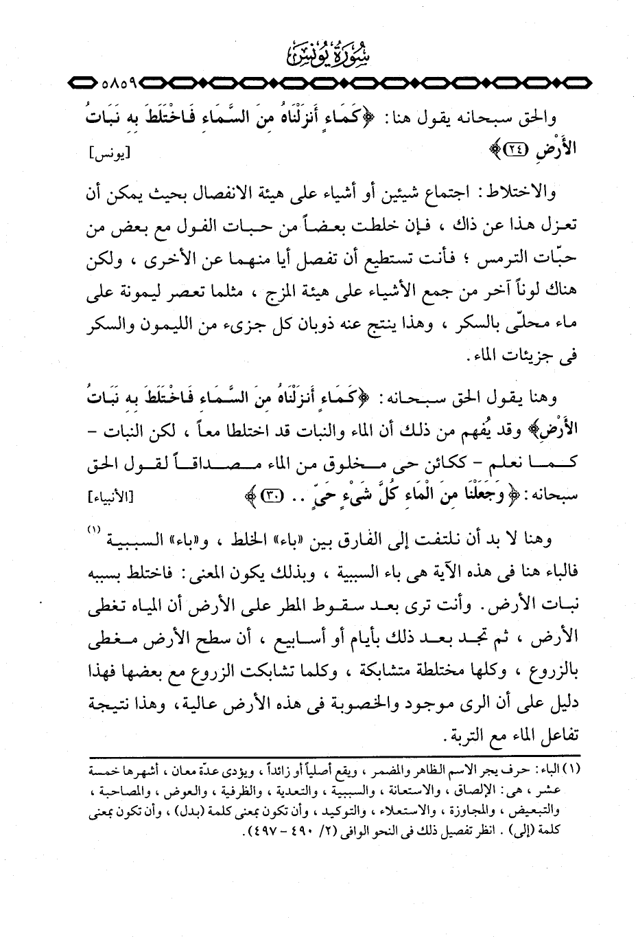 وهنا لا بد أن نلتفت إلى الفارق بين «باء» الخلط، و «باء» السببية فالباء هنا في هذه الآية هي باء السببية، وبذلك يكون المعنى: فاختلط بسببه نبات الأرض. وأنت ترى بعد سقوط المطر على الأرض أن المياه تغطي الأرض، ثم تجد بعد ذلك بأيام أو أسابيع، أن سطح الأرض مغطى بالزروع، وكلها مختلطة متشابكة، وكلما تشابكت الزروع مع بعضها فهذا دليل على أن الري موجود والخصوبة في هذه الأرض عالية، وهذا نتيجة تفاعل الماء مع التربة.