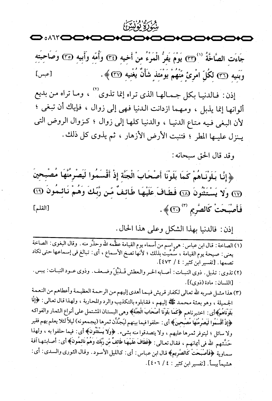 {إِنَّا بَلَوْنَاهُمْ كَمَا بَلَوْنَآ أَصْحَابَ الجنة إِذْ أَقْسَمُواْ لَيَصْرِمُنَّهَا مُصْبِحِينَ وَلاَ يَسْتَثْنُونَ فَطَافَ عَلَيْهَا طَآئِفٌ مِّن رَّبِّكَ وَهُمْ نَآئِمُونَ فَأَصْبَحَتْ كالصريم} [القلم: 1720] .