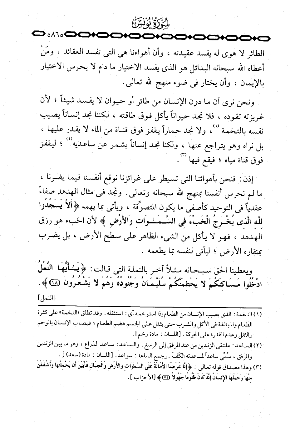 إذن: فنحن بأهوائنا التي تسيطر على غرائزنا نوقع أنفسنا فيما يضرنا، ما لم نحرس أنفسنا بمنهج الله سبحانه وتعالى. ونجد في مثال الهدهد صفاءً عقدياً في التوحيد كأصفى ما يكون المتصوِّفة، ويأتي بما يهمه {أَلاَّ يَسْجُدُواْ للَّهِ الذي يُخْرِجُ الخبء فِي السماوات والأرض} لأن الخبء هو رزق الهدهد، فهو لا يأكل من الشيء الظاهر على سطح الأرض، بل يضرب بمنقاره الأرض؛ ليأتي لنفسه بما يطعمه.