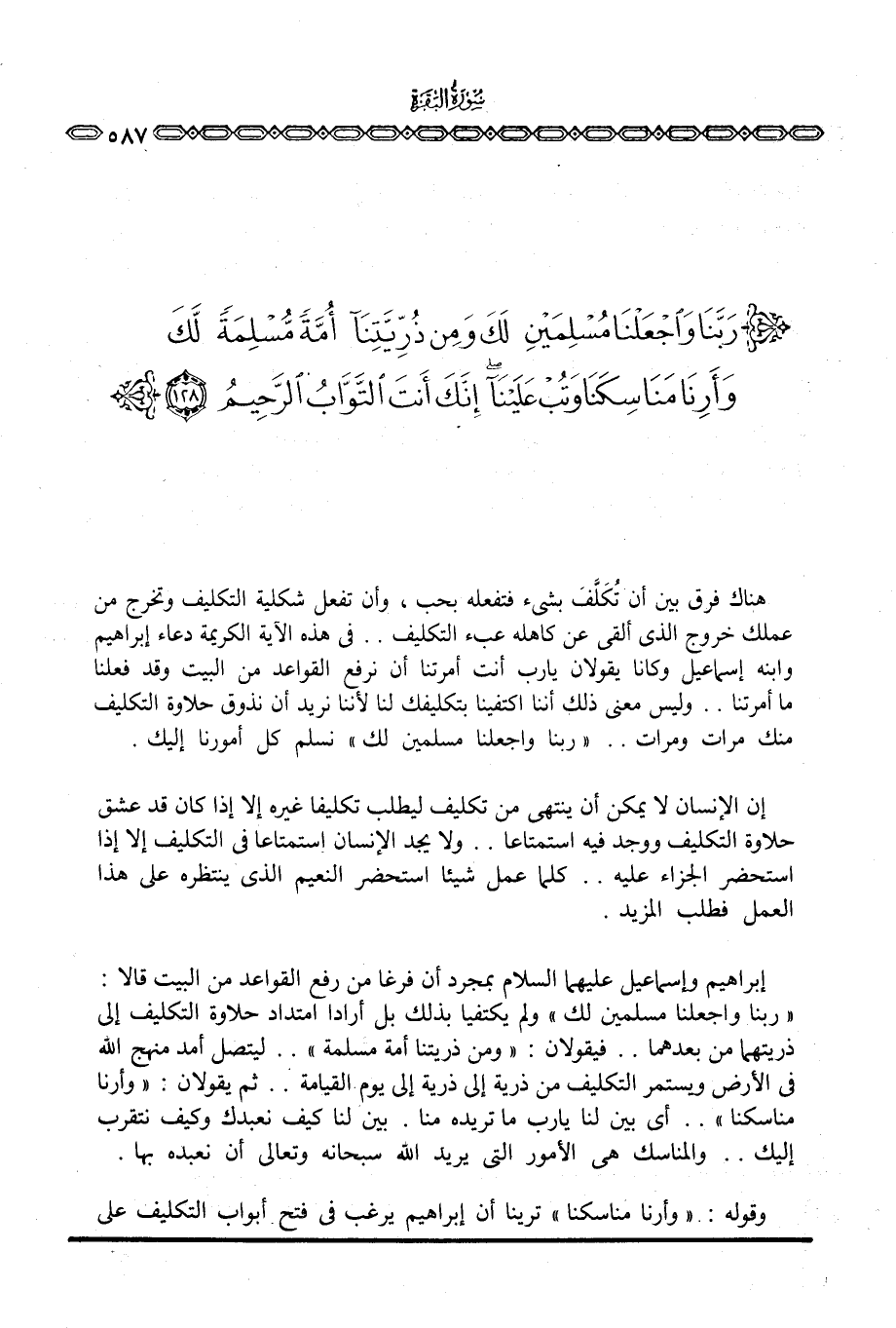 هناك فرق بين أن تُكَلَّفَ بشيء فتفعله بحب، وأن تفعل شكلية التكليف وتخرج من عملك خروج الذي ألقى عن كاهله عبء التكليف. . في هذه الآية الكريمة دعاء إبراهيم وابنه إسماعيل وكانا يقولان يا رب أنت أمرتنا أن نرفع القواعد من البيت وقد فعلنا ما أمرتنا. . وليس معنى ذلك أننا اكتفينا بتكليفك لنا لأننا نريد أن نذوق حلاوة التكليف منك مرات ومرات. . {رَبَّنَا واجعلنا مُسْلِمَيْنِ لَكَ} نسلم كل أمورنا إليك.