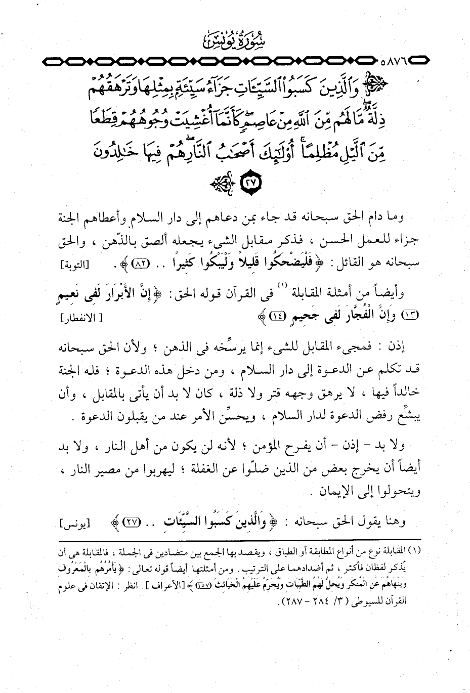 إذن: فمجيء المقابل للشيء إنما يرسِّخه في الذهن؛ ولأن الحق سبحانه قد تكلم عن الدعوة إلى دار السلام، ومن دخل هذه الدعوة؛ فله الجنة خالداً فيها، لا يرهق وجهه قتر ولا ذلة، كان لا بد أن يأتي بالمقابل، وأن يبشِّع رفض الدعوة لدار السلام، ويحسِّن الأمر عند من يقبلون الدعوة.