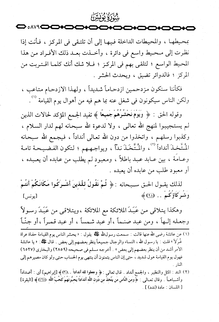 بمحيطها، والمحيطات الداخلة فيها إلى أن تلتقي في المركز، فأنت إذا نظرت إلى محيط واسع في دائرة، وأخذت بعد ذلك الأفراد من هذا المحيط الواسع؛ لتلقي بهم في المركز؛ فلا شك أنك كلما اقتربت من المركز؛ فالدوائر تضيق، ويحدث الحشر.