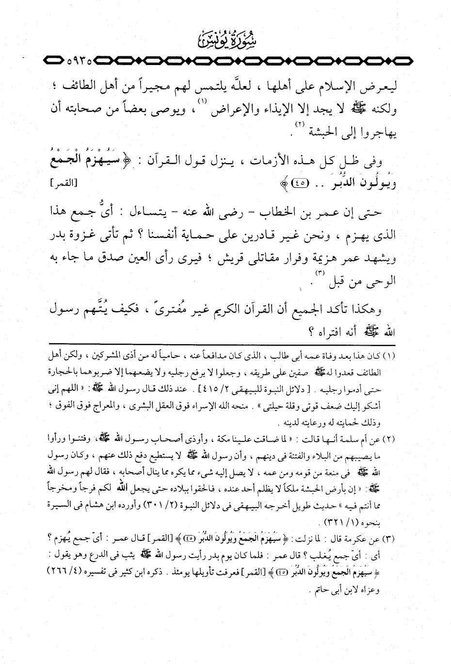 حتى إن عمر بن الخطاب رَضِيَ اللَّهُ عَنْه يستاءل: أيُّ جمع هذا الذي يهزم، ونحن غير قادرين على حماية أنفسنا؟ ثم تأتي غزوة بدر ويشهد عمر هزيمة وفرار مقاتلي قريش؛ فيرى رأي العين صدق ما جاء به الوحي من قبل.