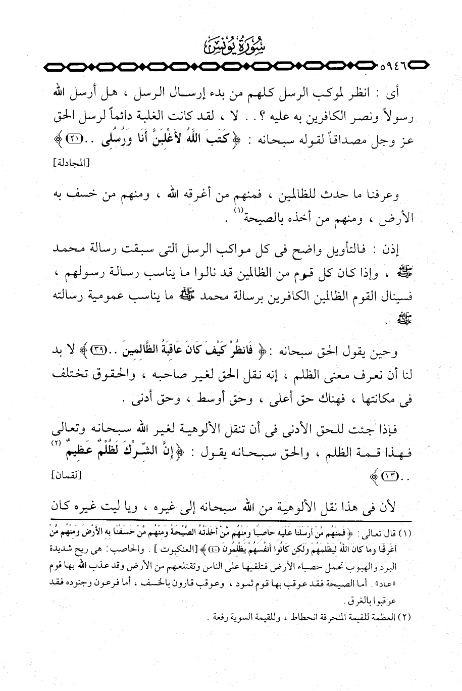 إذن: فالتأويل واضح في كل مواكب الرسل التي سبقت رسالة محمد صَلَّى اللَّهُ عَلَيْهِ وَسَلَّم َ، وإذا كان كل قوم من الظالمين قد نالوا ما يناسب رسالة رسولهم، فسينال القوم الظالمين الكافرين برسالة محمد صَلَّى اللَّهُ عَلَيْهِ وَسَلَّم َ ما يناسب عمومية رسالته صَلَّى اللَّهُ عَلَيْهِ وَسَلَّم َ.