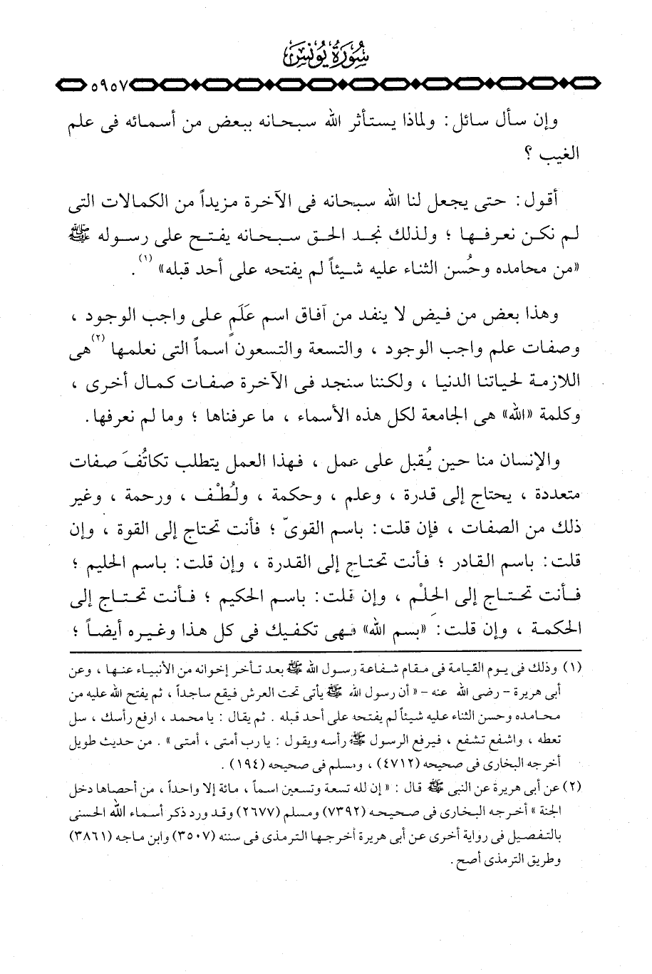 وهذا بعض من فيض لا ينفد من آفاق اسم عَلَمٍ على واجب الوجود، وصفات علم واجب الوجود، والتسعة والتسعون اسماً التي نعلمها هي اللازمة لحياتنا الدنيا، ولكننا سنجد في الآخرة صفات كمال أخرى، وكلمة «الله» هي الجامعة لكل هذه الأسماء، ما عرفناها؛ وما لم نعرفها.