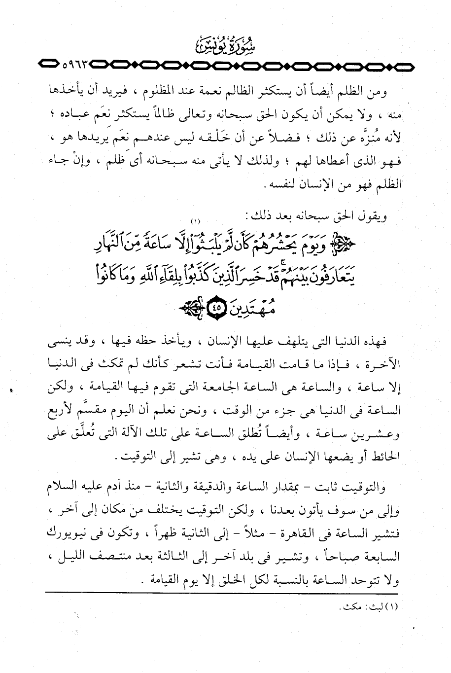 فهذه الدنيا التي يتلهف عليها الإنسان، ويأخذ حظه فيها، وقد ينسى الآخرة، فإذا ما قامت القيامة فأنت تشعر كأنك لم تمكث في الدنيا إلا ساعة، والساعة هي الساعة الجامعة التي تقوم فيها القيامة، ولكن الساعة في الدنيا هي جزء من الوقت، ونحن نعلم أن اليوم مقسَّم لأربع وعشرين ساعة، وأيضاً تُطلق الساعة على تلك الآلة التي تُعلَّق على الحائط أو يضعها الإنسان على يده، وهي تشير إلى التوقيت.