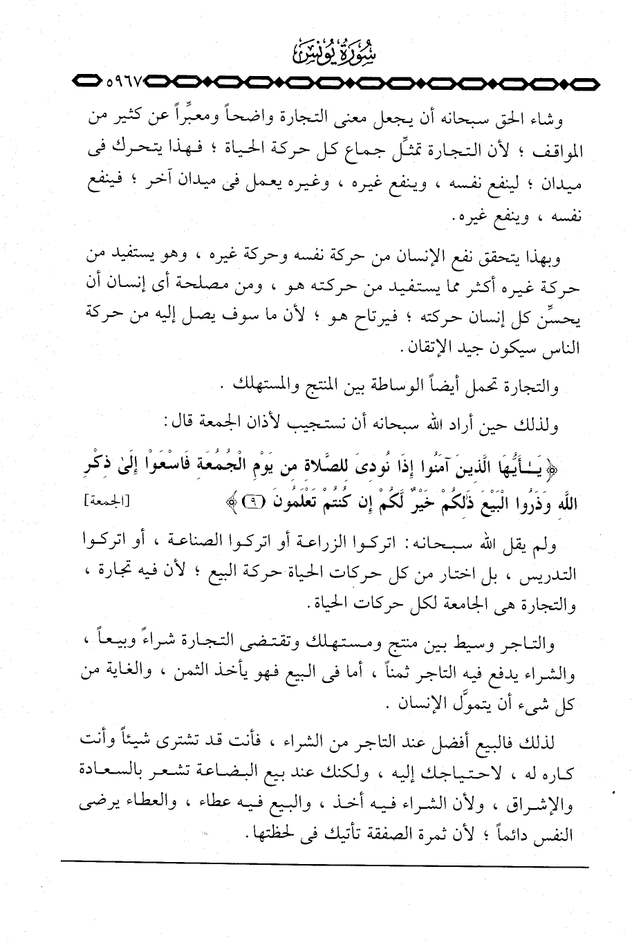 ولم يقل الله سبحانه: اتركوا الزراعة أو اتركوا الصناعة، أو اتركوا التدريس، بل اختار من كل حركات الحياة حركة البيع؛ لأن فيه تجارة، والتجارة هي الجامعة لكل حركات الحياة.