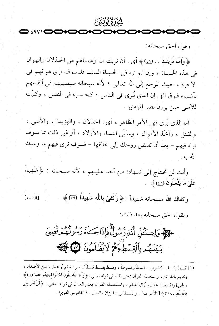{وَإِمَّا نُرِيَنَّكَ} [يونس: 46] أي: أن نريك ما وعدناهم من الخذلان والهوان في هذه الحياة، وإن لم تره في الحياة الدنيا فلسوف ترى هوانهم في الآخرة، حيث المرجع إلى الله تعالى؛ لأنه سبحانه سيصيبهم في أنفسهم بأشياء فوق الهوان الذي يُرى في الناس؛ كحسرة في النفس، وكبْت للأسى حين يرون نصر المؤمنين.