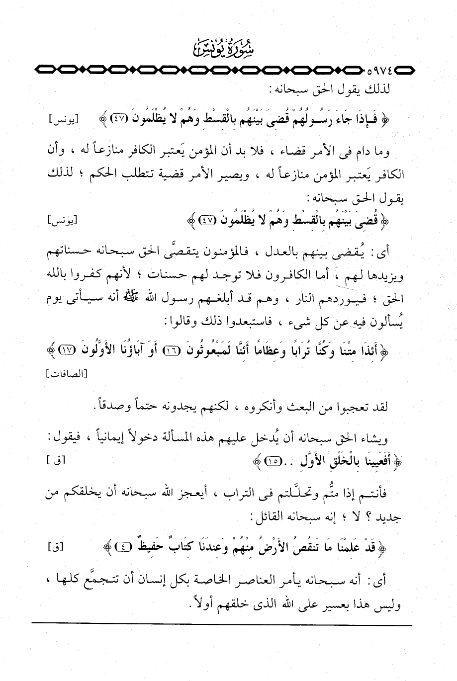 أي: يُقضي بينهم بالعدل، فالمؤمنون يتقصَّى الحق سبحانه حسناتهم ويزيدها لهم، أما الكافرون فلا توجد لهم حسنات؛ لأنهم كفروا بالله الحق؛ فيوردهم النار، وهم قد أبلغهم رسول الله صَلَّى اللَّهُ عَلَيْهِ وَسَلَّم َ أنه سيأتي يوم يُسألون فيه عن كل شيء، فاستبعدوا ذلك وقالوا: