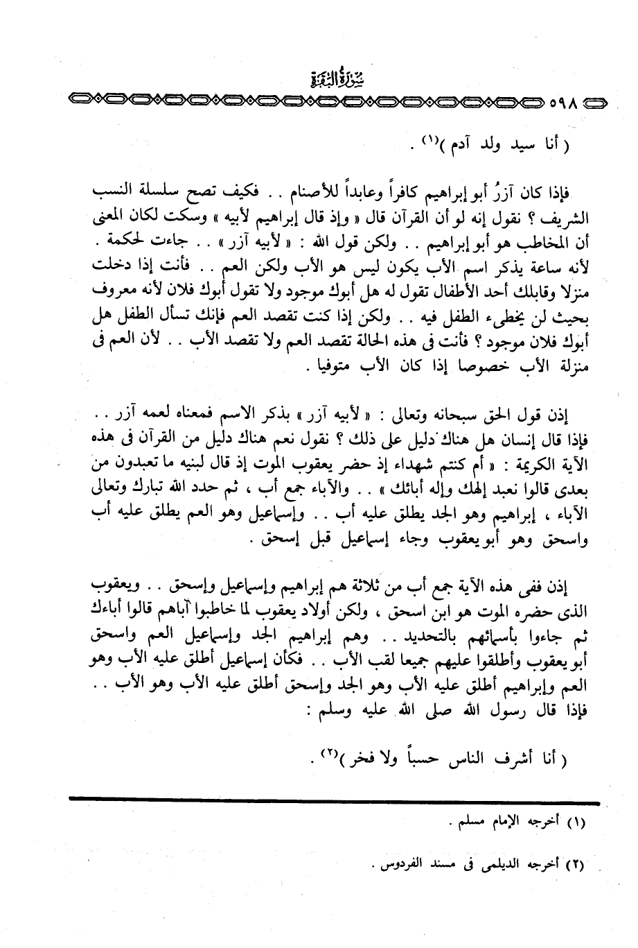 فإذا كان آزرُ أبو إبراهيم كافراً وعابداً للأصنام. . فكيف تصح سلسلة النسب الشريف؟ نقول إنه لو أن القرآن قال {وَإِذْ قَالَ إِبْرَاهِيمُ لأَبِيهِ} وسكت لكان المعنى أن المخاطب هو أبو إبراهيم. . ولكن قول الله: {لأَبِيهِ آزَرَ} . . جاءت لحكمة. لأنه ساعة يذكر اسم الأب يكون ليس الأب ولكن العم. . فأنت إذا دخلت منزلا وقابلك أحد الأطفال تقول له هل أبوك موجود ولا تقول أبوك فلان لأنه معروف بحيث لن يخطئ الطفل فيه. . ولكن إذا كنت تقصد العم فإنك تسأل الطفل هل أبوك فلان موجود؟ فأنت في هذه الحالة تقصد العم ولا تقصد الأب. . لأن العم في منزلة الأب خصوصا إذا كان الأب متوفيا.