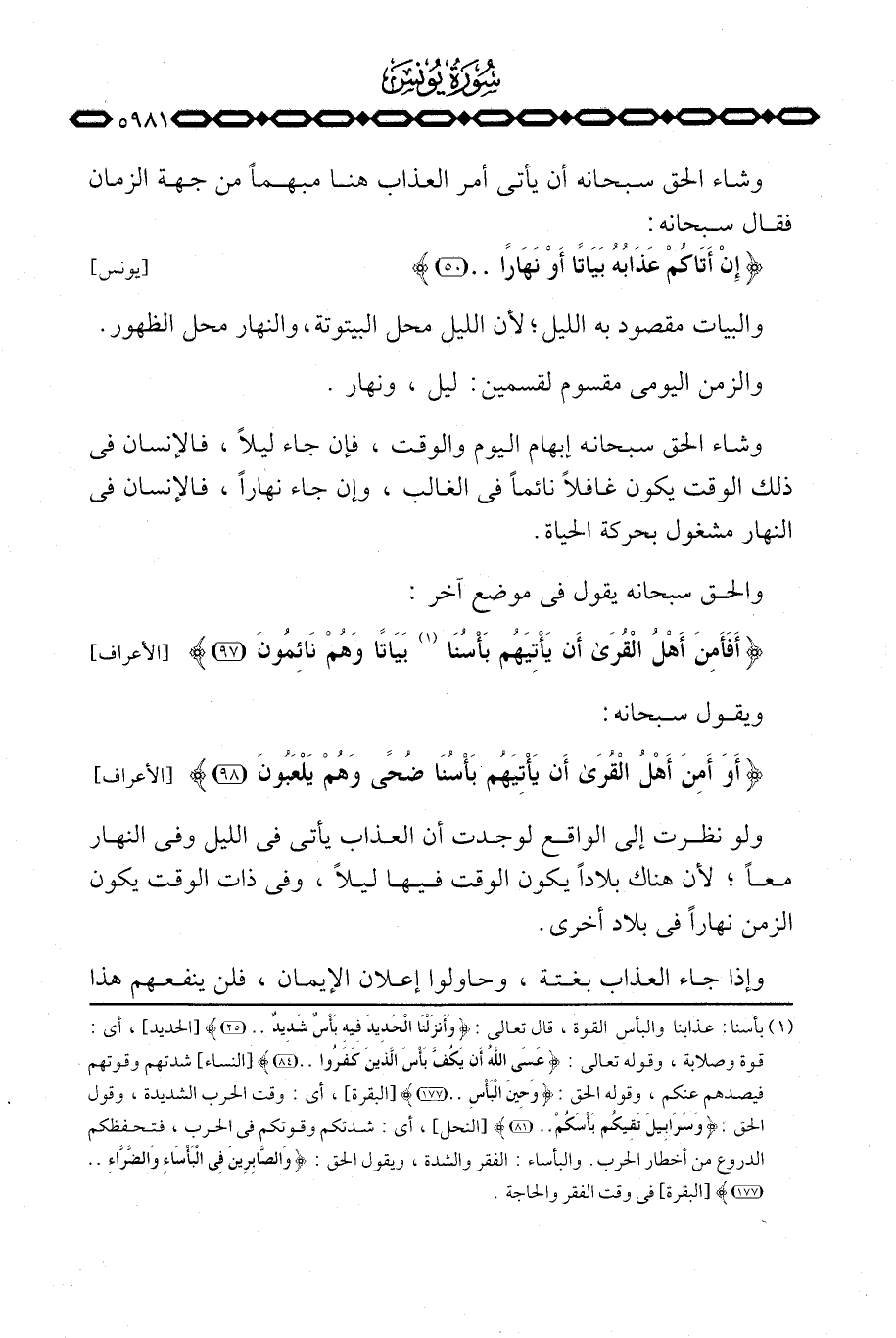 ولو نظرت إلى الواقع لوجدت أن العذاب يأتي في الليل وفي النهار معاً، لأن هناك بلاداً يكون الوقت فيها ليلاً، وفي ذات الوقت يكون الزمن نهاراً في بلاد أخرى.