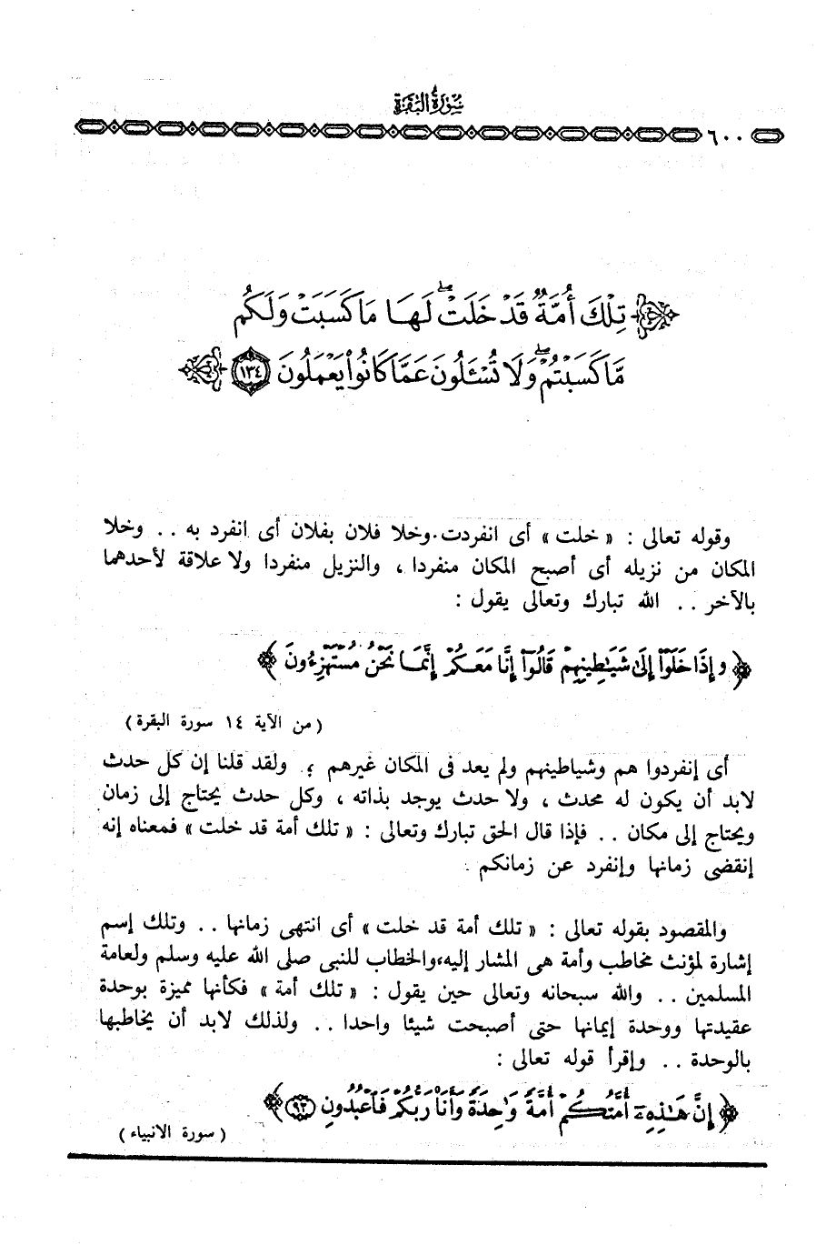 والمقصود بقوله تعالى: {تِلْكَ أُمَّةٌ قَدْ خَلَتْ} أي انتهى زمانها. . وتلك إسم إشارة لمؤنث مخاطب وأمة هي المشار إليه، والخطاب للنبي صَلَّى اللَّهُ عَلَيْهِ وَسَلَّم َ ولعامة المسلمين. . والله سبحانه وتعالى حين يقول: {تِلْكَ أُمَّةٌ} فكأنها مميزة بوحدة عقيدتها ووحدة إيمانها حتى أصبحت شيئا واحدا. . ولذلك لابد أن يخاطبها بالوحدة. . واقرأ قوله تعالى: {إِنَّ هذه أُمَّتُكُمْ أُمَّةً وَاحِدَةً وَأَنَاْ رَبُّكُمْ فاعبدون} [الأنبياء: 92]