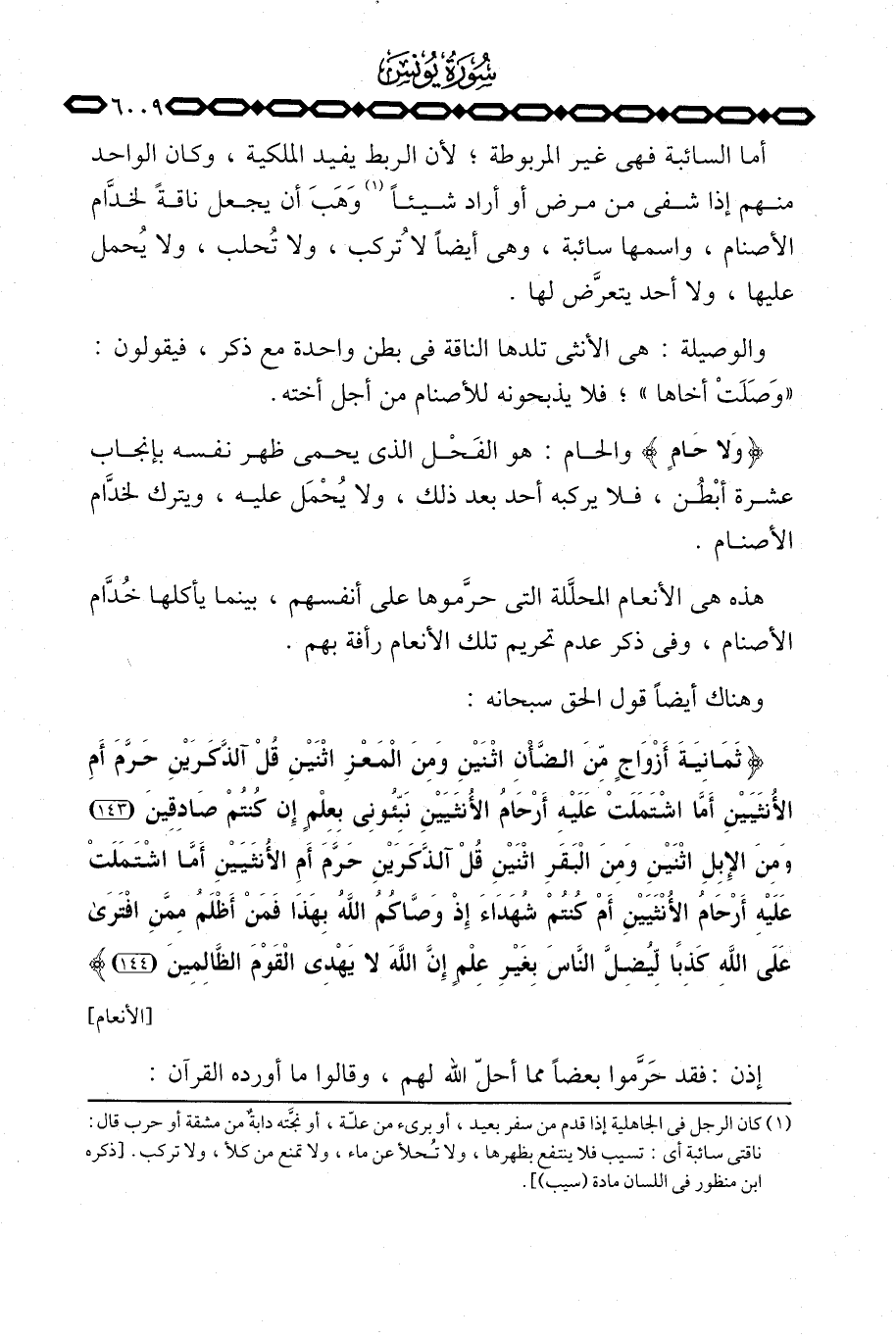 أما السائبة فهي غير المربوطة؛ لأن الربط يفيد الملكية، وكان الواحد منهم إذى شفي من مرض أو أراد شيئاً وَهَبَ أن يجعل ناقةً لخدَّام الأصنام، واسمها سائبة، وهي أيضاً لا تُركب، ولا تُحلب، ولا يُحمل عليها، ولا أحد يتعرَّض لها.