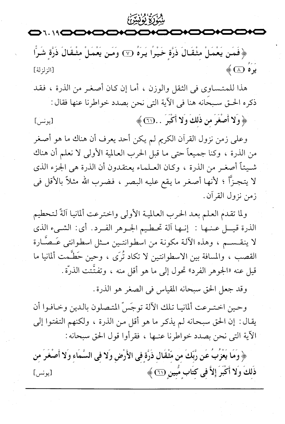 وعلى زمن نزول القرآن الكريم لم يكن أحد يعرف أن هناك ما هو أصغر من الذرة، وكنا جميعاً حتى ما قبل الحرب العالمية الأولى لا نعلم أن هناك شيئاً أصغر من الذرة، وكان العلماء يعتقدون أن الذرة هي الجزء الذي لا يتجزَّا؛ لأنها أصغر ما يقع عليه البصر، فضرب الله مثلاً بالأقل في زمن نزول القرآن.