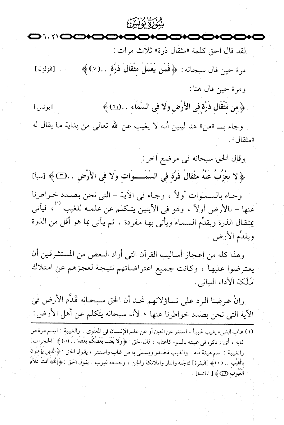 وجاء بالسموات أولاً، وجاء في الآية التي نحن بصدد خواطرنا عنها بالأرض أولاً، وهو في الآيتين يتكلم عن علمه للغيب، فيأتي بمثقال الذرة ويقدِّم السماء ويأتي بها مفردة، ثم يأتي بما هو أقل من الذرة ويقدِّم الأرض.