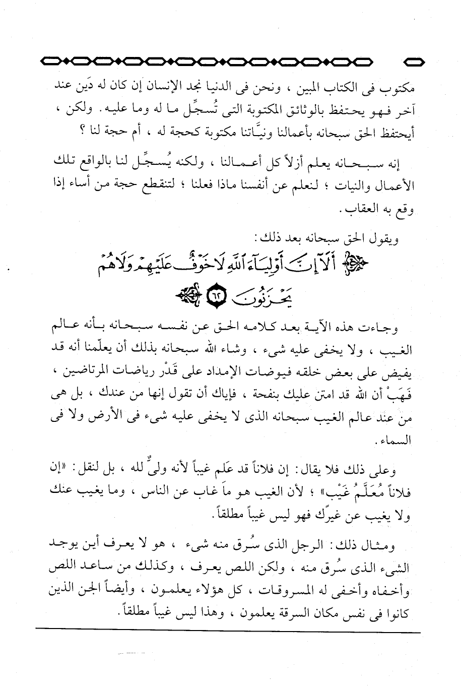 وعلى ذلك فلا يقال: إن فلاناً قد عَلِم غيباً لأنه وليٌّ لله، بل لنقل: «إن فلانا مُعَلَّمُ غَيْبٍ» ؛ لأن الغيب ما غاب عن الناس، وما يغيب عنك ولا يغيب عن غيرك فهو ليس غيباً مطلقاً.