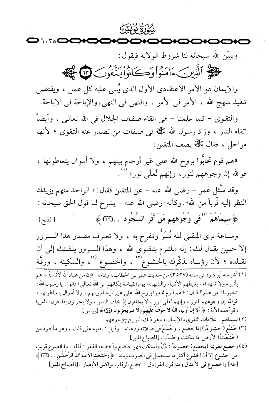 وقد سئُل عمر رَضِيَ اللَّهُ عَنْه عن المتقين فقال:» الواحد منهم يزيدك النظر إليه قُرباً من الله «. وكأنه رَضِيَ اللَّهُ عَنْه يشرح لنا قول الحق سبحانه: