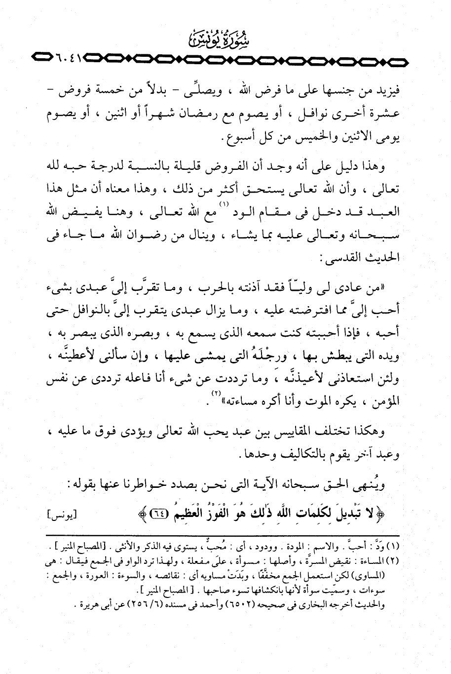«من عادى لي وليّاً فقد آذنته بالحرب، وما تقرَّب إليَّ عبدي بشيء أحب إليَّ مما افترضته عليه، وما يزال عبدي يتقرب إليَّ بالنوافل حتى أحبه، فإذا أحببته كنت سمعه الذي يسمع به، وبصره الذي يبصر به، ويده التي يبطش بها، ورِجْلَهُ التي يمشي عليها، وإن سألني لأعطينَّه، ولئن استعاذني لأعيذنَّه، وما ترددت عن شيء أنا فاعله ترددي عن نفس المؤمن، يكره الموت وأنا أكره مساءته» .