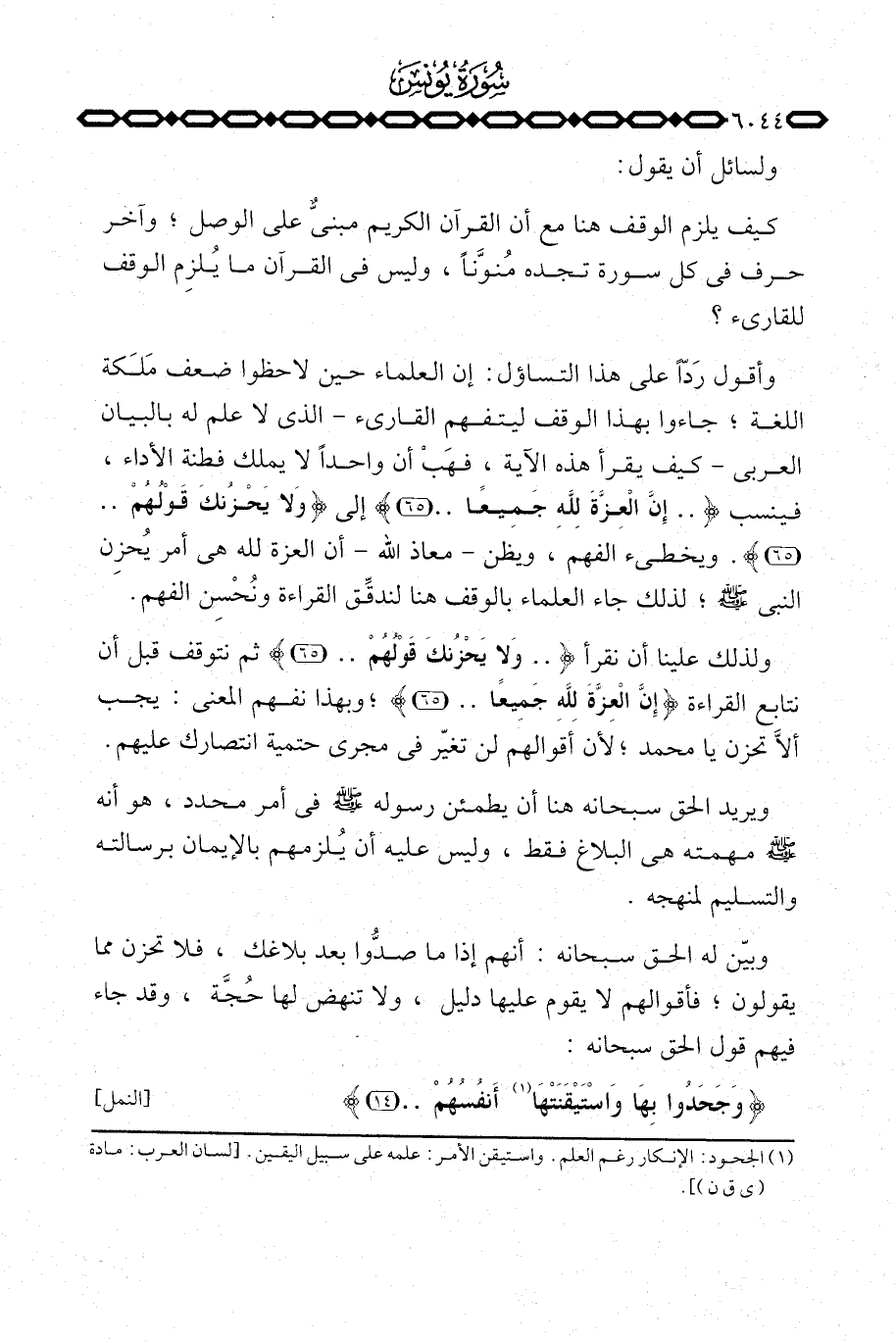 وأقول رَدّاً على هذا التساؤل: إن العلماء حين لاحظوا ضعف مَلَكة اللغة؛ جاءوا بهذا الوقف ليتفهم القارىء الذي لا علم له بالبيان العربي كيف يقرأ هذه الآية، فهَبْ أن واحداً لا يملك فطنة الأداء، فينسب {إِنَّ العزة للَّهِ جَمِيعاً} [يونس: 65] إلى {وَلاَ يَحْزُنكَ قَوْلُهُمْ} [يونس: 65] . ويخطىء الفهم، ويظن معاذ الله أن العزة لله هي أمر يُحزِن النبي صَلَّى اللَّهُ عَلَيْهِ وَسَلَّم َ؛ لذلك جاء العلماء بالوقف هنا لندقِّق القراءة ونُحْسِن الفهم.