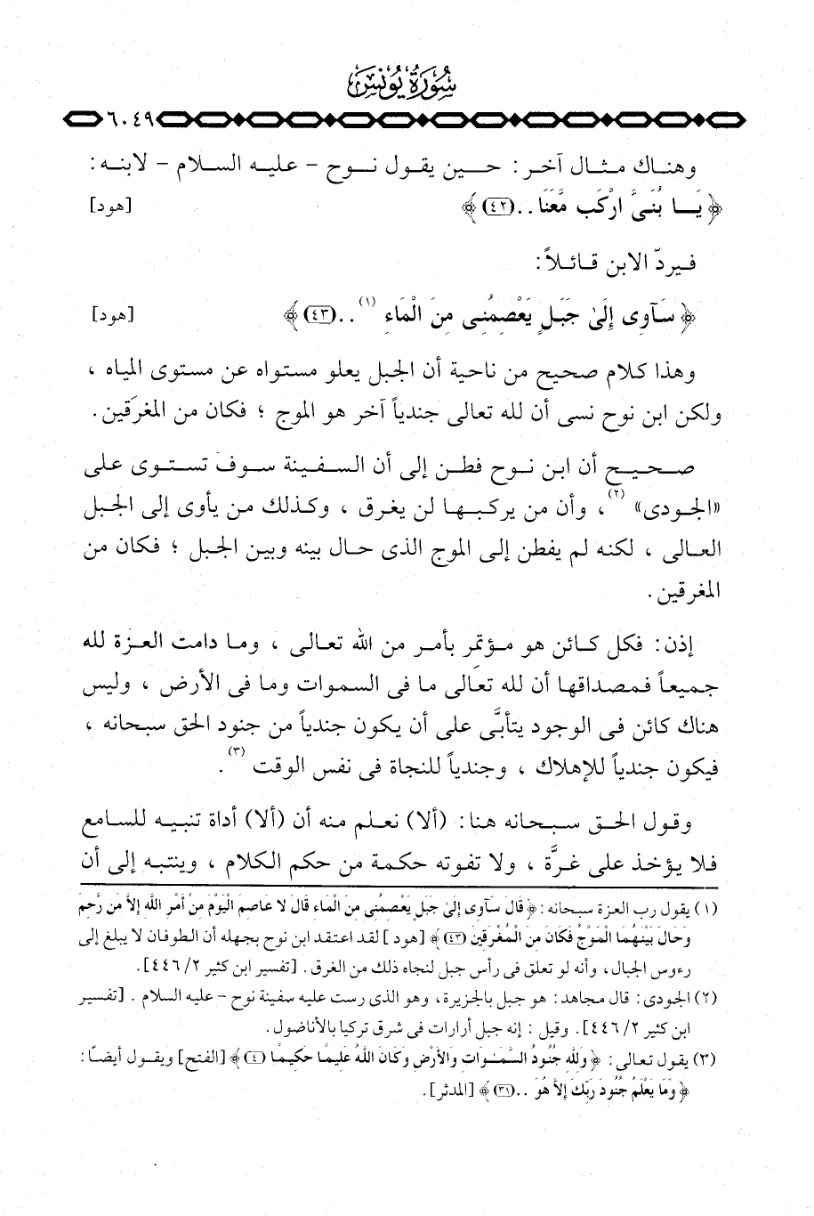 صحيح أن ابن نوح فطن إلى أن السفينة سوف تستوي على «الجدوى» ، وأن من يركبها لن يغرق، وكذلك من يأوي إلى الجبل العالي، لكنه لم يفطن إلى الموج الذي حال بينه وبين الجبل؛ فكان من المغرقين.