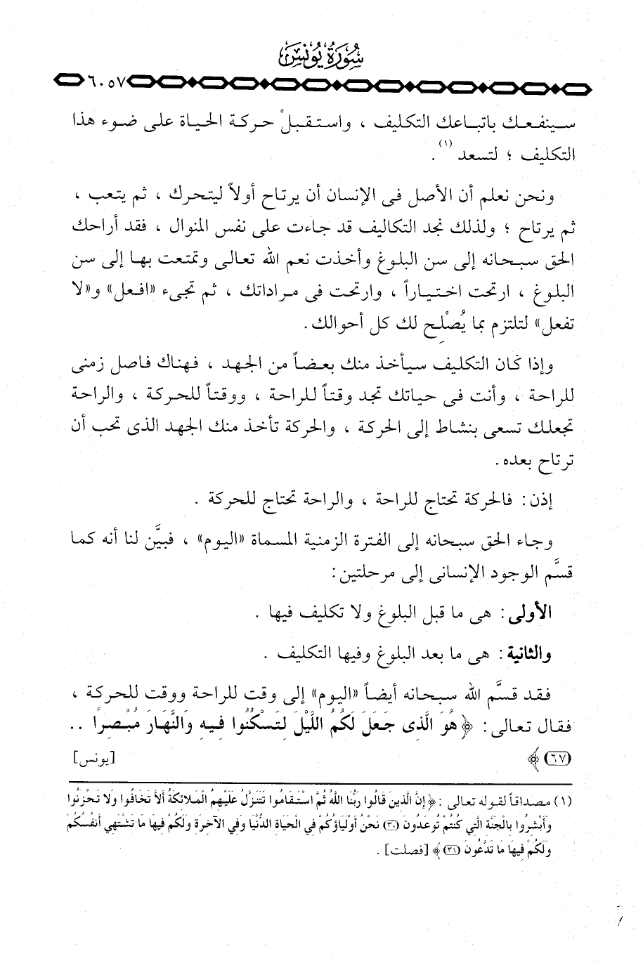 وإذا كان التكليف سيأخذ منك بعضاً من الجهد، فهناك فاصل زمني للراحة، وأنت في حياتك تجد وقتاً للراحة، ووقتاً للحركة، والراحة تجعلك تسعى بنشاط إلى الحركة، والحركة تأخذ منك الجهد الذي تحب أن ترتاح بعده.