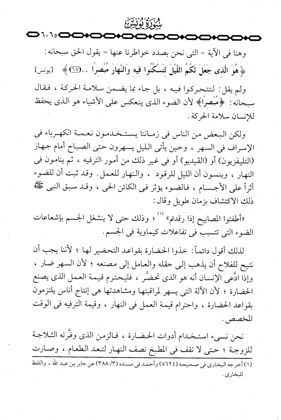 لذلك أقول دائماً: خذوا الحضارة بقواعد التحضير لها؛ لأننا يجب أن نتيح للفلاح أن يذهب إلى حقله والعامل إلى مصنعه؛ لأن السهر ضار، وإذا ادَّعى الإنسان أنه هو الذي تحضَّر، فليحترم قيمة العمل الذي يصنع الحضارة؛ لأن الآلة التي يسهر لمراقبتها ومشاهدتها هي إنتاج أناس يلتزمون بقواعد الحضارة؛ واحترام قيمة العمل في النهار، وقيمة الترفيه في الوقت المخصص.