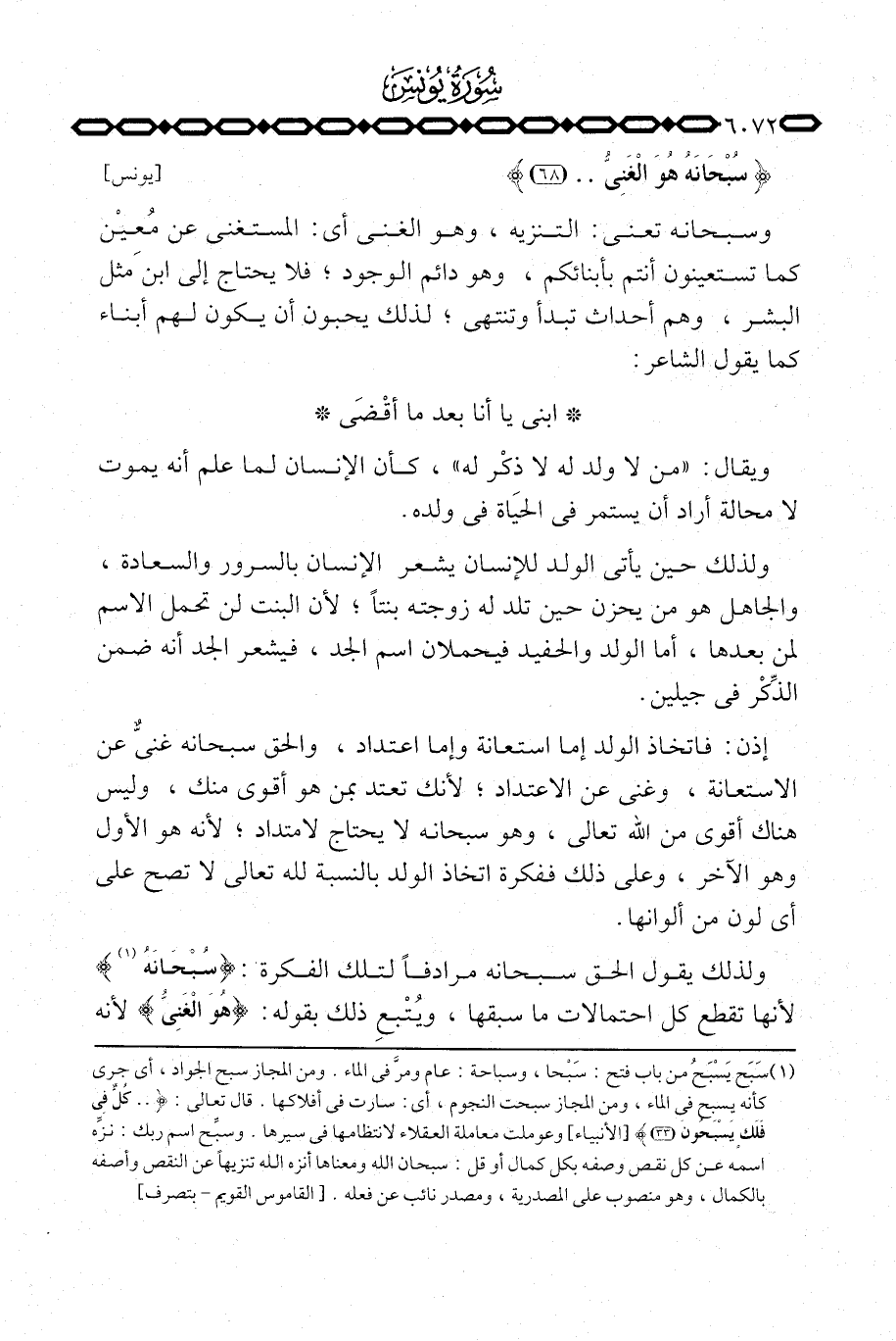 وسبحانه تعني: التنزيه، وهو الغني أي: المستغني عن مُعِين كما تستعينون أنتم بأبنائكم، وهو دائم الوجود؛ فلا يحتاج إلى ابن مثل البشر، وهم أحداث تبدأ وتنتهي؛ لذلك يحبون أن يكون لهم أبناء كما يقول الشاعر: