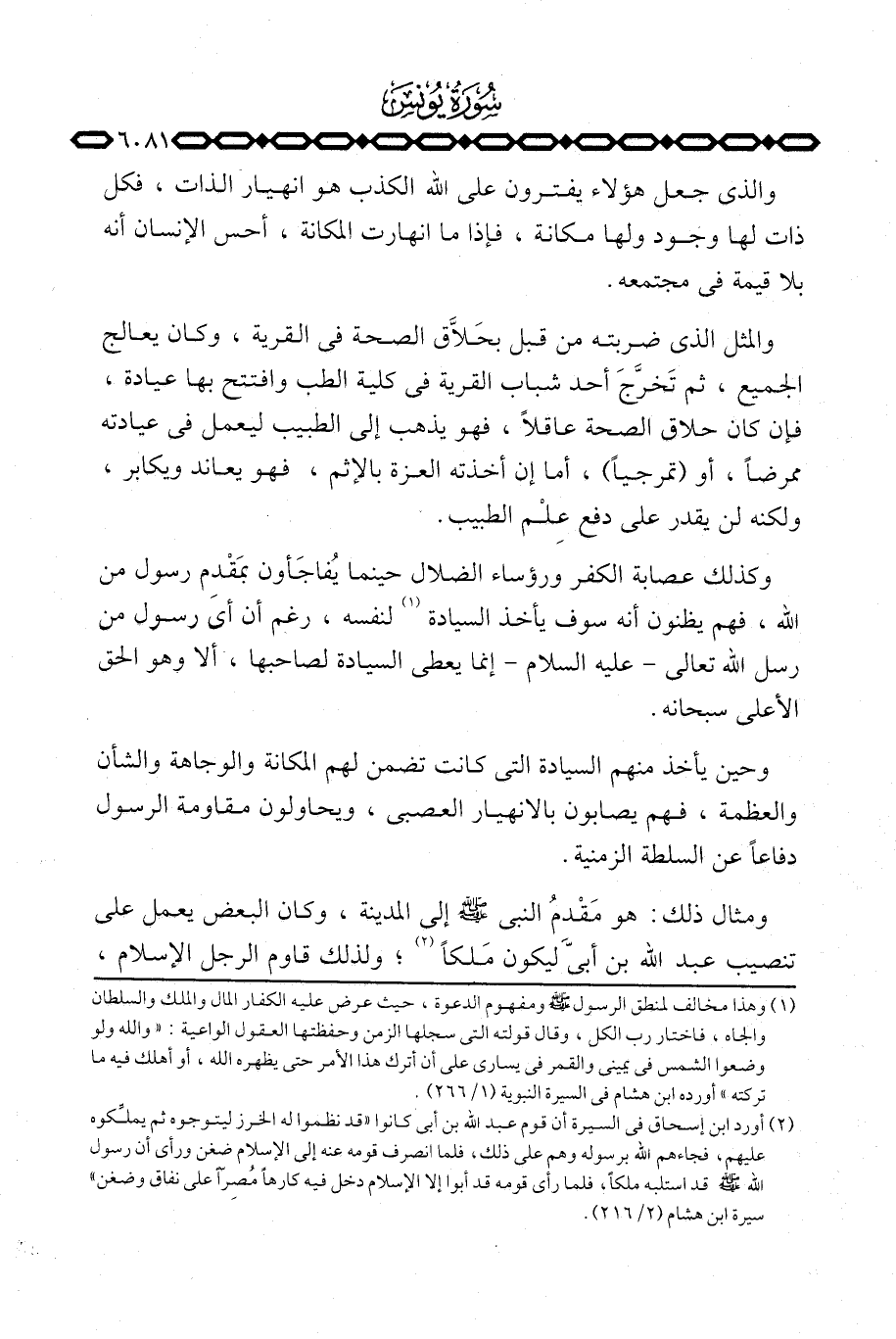 ومثال ذلك: هو مَقْدِمُ النبي صَلَّى اللَّهُ عَلَيْهِ وَسَلَّم َ إلى المدينة، وكان البعض يعمل على تنصيب عبد الله بن أبيّ ليكون مَلكاً؛ ولذلك قاوم الرجل الإسلام،