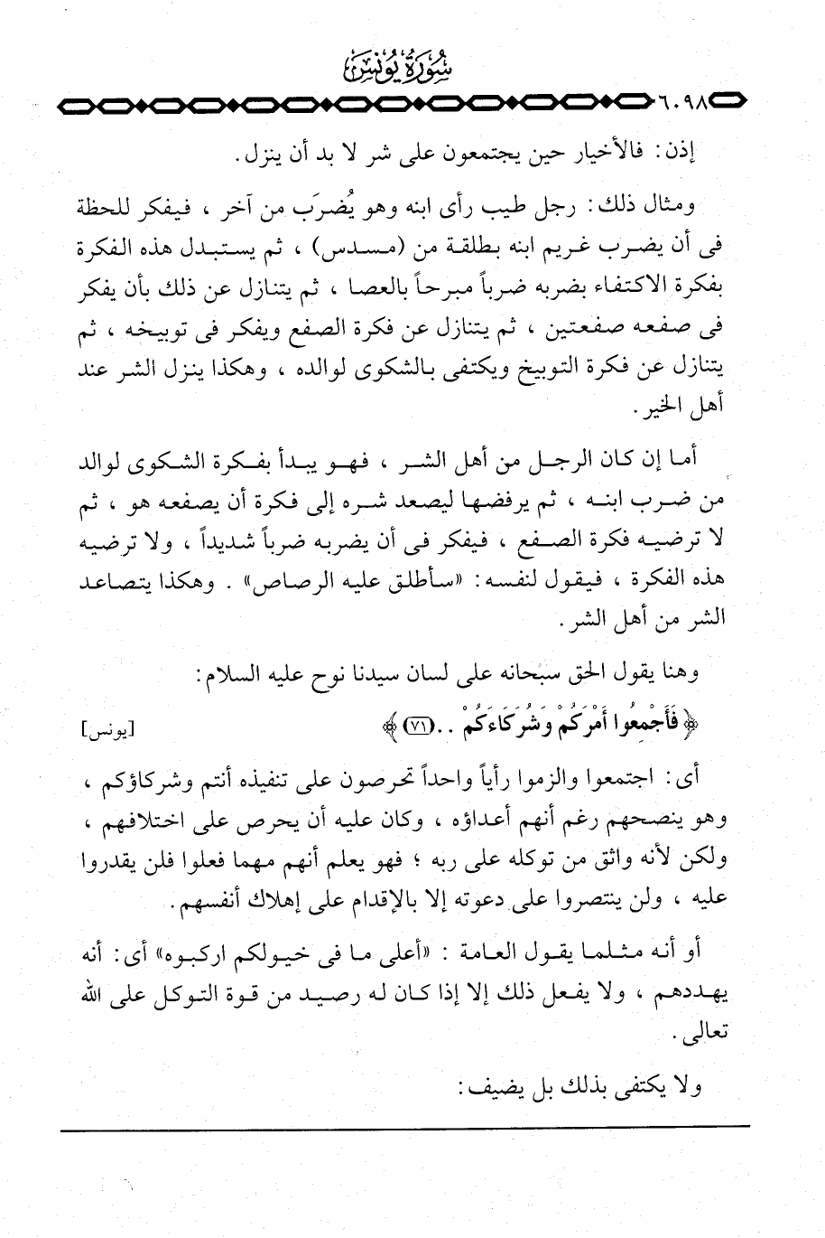 أما إن كان الرجل من أهل الشر، فهو يبدأ بفكرة الشكوى لوالد من ضرب ابنه، ثم يرفضها ليصعد شره إلى فكرة أن يصفعه هو، ثم لا ترضيه فكرة الصفع، فيفكر في أن يضربه ضرباً شديداً، ولا ترضيه هذه الفكرة، يقول لنفسه: «سأطلق عليه الرصاص» .