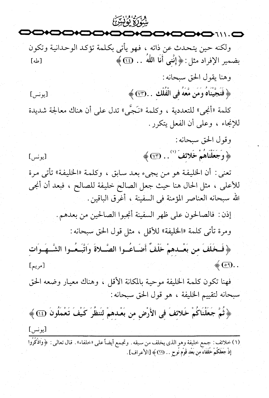 تعني: أن الخليفة هو من يجيء بعد سابق، وكلمة «الخليفة» تأتي مرة للأعلى، مثل الحال هنا حيث جعل الصالح خليفة للصالح، فبعد أن أنجى الله سبحانه العناصر المؤمنة في السفينة، أغرق الباقين.
