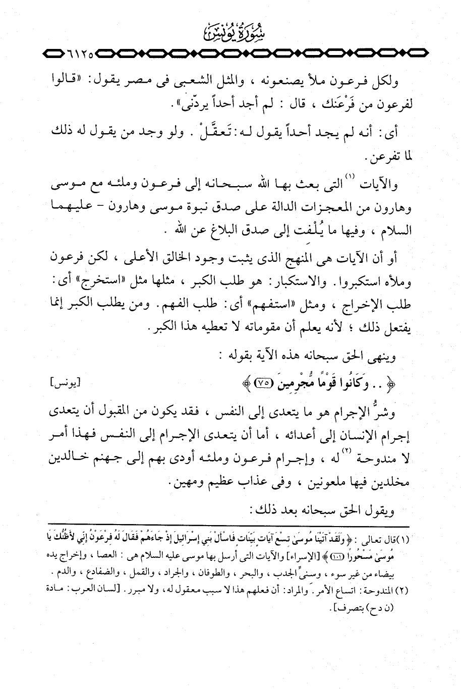 وشرُّ الإجرام ما يتعدى إلى النفس، فقد يكون من المقبول أن يتعدى إجرام الإنسان إلى أعدائه، أما أن يتعدى الإجرام إلى النفس فهذا أمر لا مندوحة له، وإجرام فرعون وملئه أودى بهم إلى جهنم خالدين مخلدين فيها ملعونين، وفي عذاب عظيم ومهين.