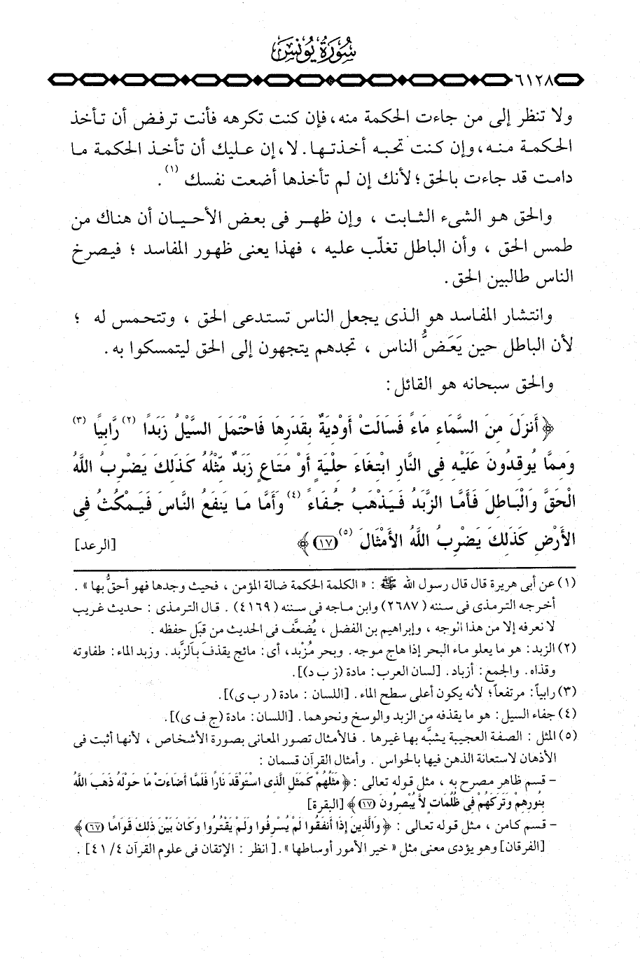 {أَنَزَلَ مِنَ السمآء مَآءً فَسَالَتْ أَوْدِيَةٌ بِقَدَرِهَا فاحتمل السيل زَبَداً رَّابِياً وَمِمَّا يُوقِدُونَ عَلَيْهِ فِي النار ابتغآء حِلْيَةٍ أَوْ مَتَاعٍ زَبَدٌ مِّثْلُهُ كذلك يَضْرِبُ الله الحق والباطل فَأَمَّا الزبد فَيَذْهَبُ جُفَآءً وَأَمَّا مَا يَنفَعُ الناس فَيَمْكُثُ فِي الأرض كذلك يَضْرِبُ الله الأمثال} [الرعد: 17] .