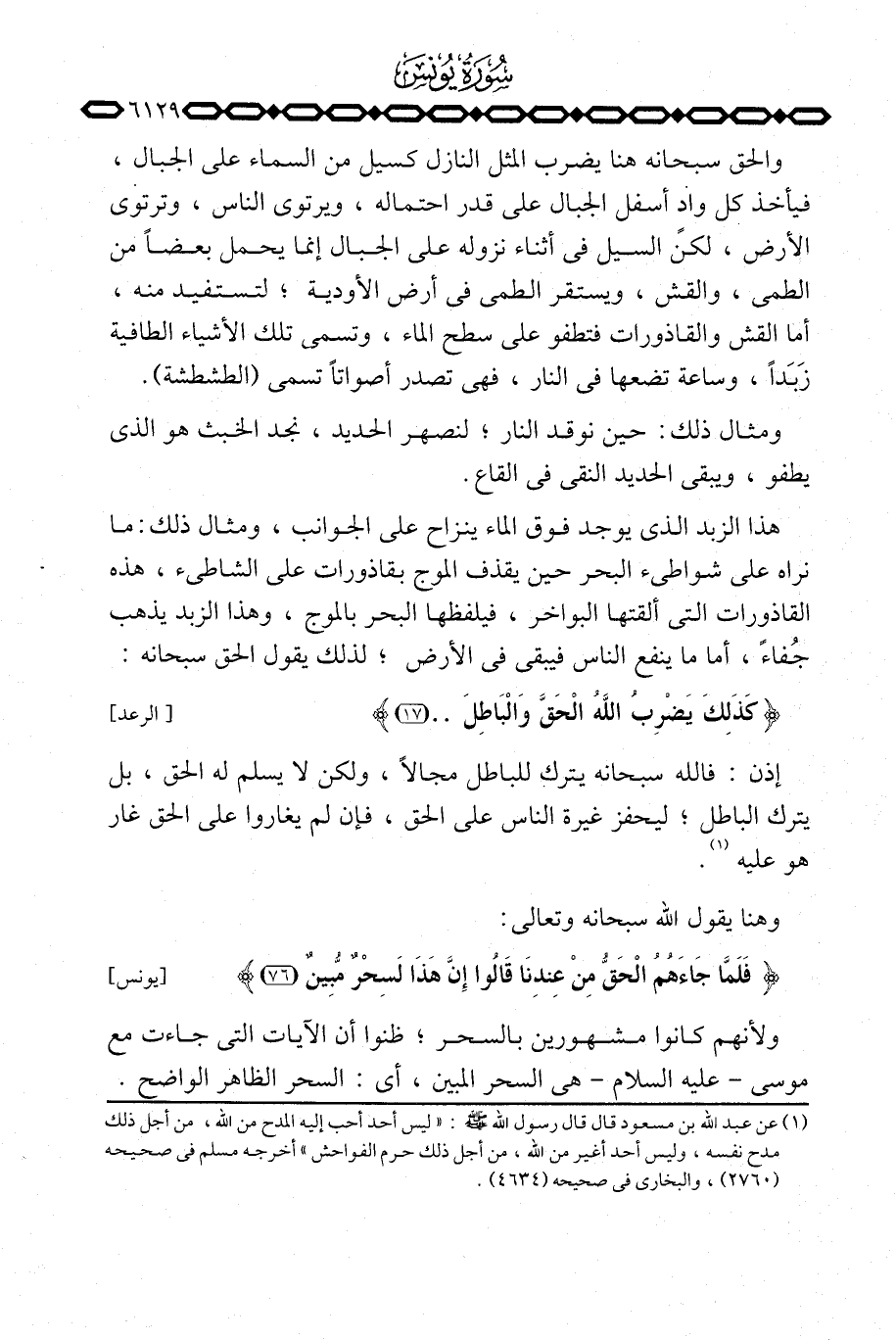 ومثال ذلك: حين نوقد النار؛ لنصهر الحديد، نجد الخبث هو الذي يطفو، ويبقى الحديد النقي في القاع.