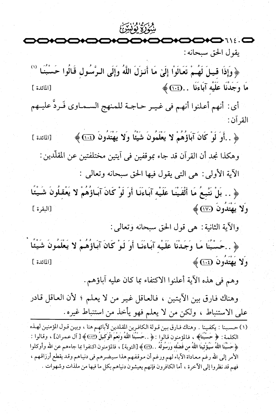 {حَسْبُنَا مَا وَجَدْنَا عَلَيْهِ آبَاءَنَآ أَوَلَوْ كَانَ آبَاؤُهُمْ لاَ يَعْلَمُونَ شَيْئاً وَلاَ يَهْتَدُونَ} [المائدة: 104] .