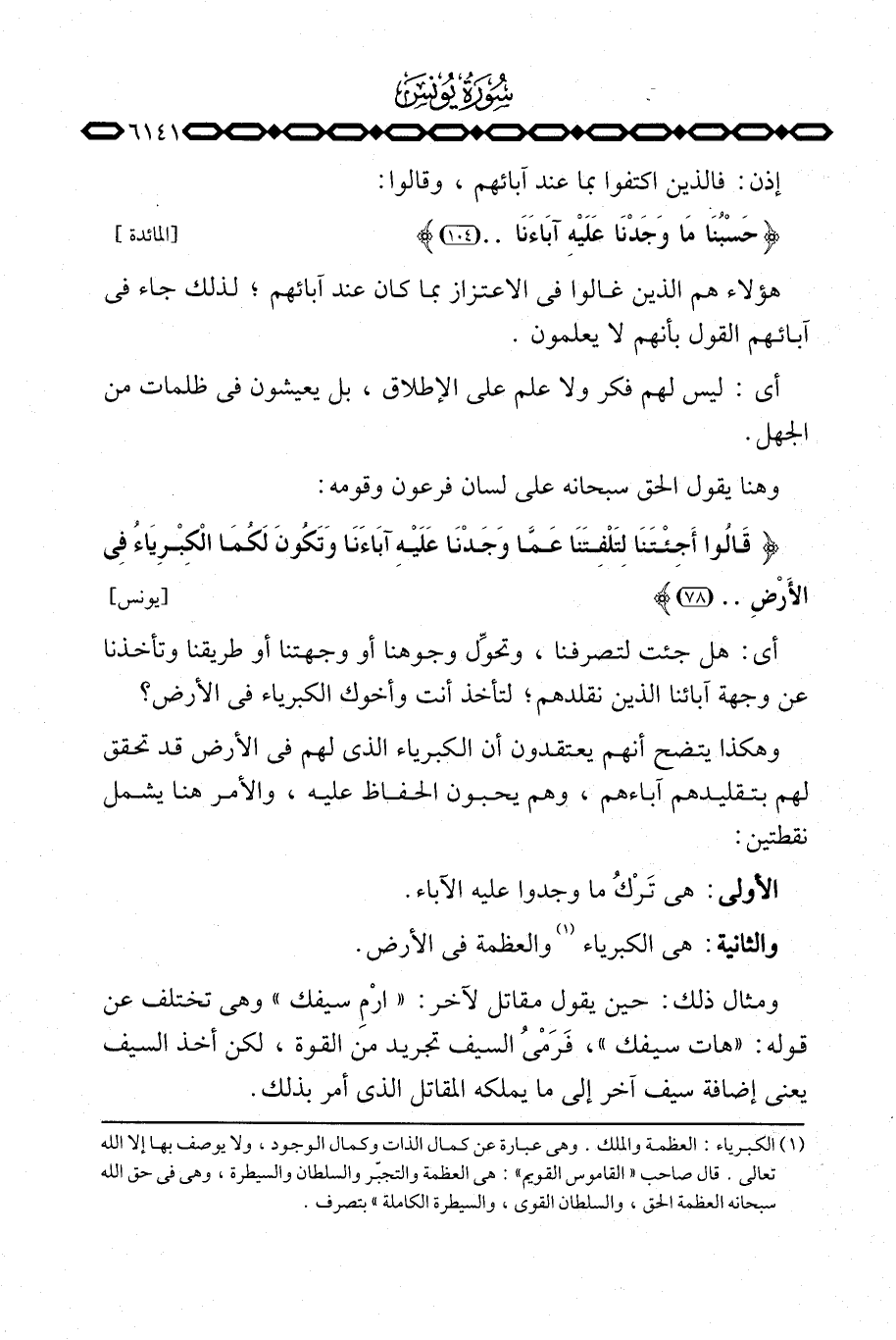 وهكذا يتضح أنهم يعتقدون أن الكبرياء الذي لهم في الأرض قد تحقق لهم بتقليدهم آباءهم، وهم يحبون الحفاظ عليه، والأمر هنا يشمل نقطتين: