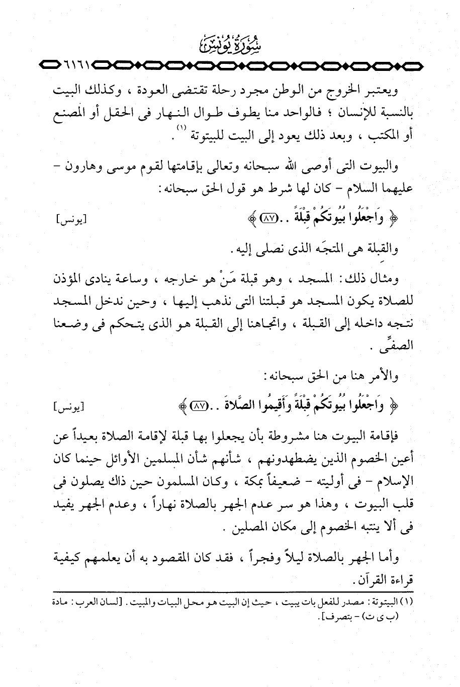 فإقامة البيوت هنا مشروطة بأن يجعلوا بها قبلة لإقامة الصلاة بعيداً عن أعين الخصوم الذين يضطهونهم، شأنهم شأن المسلمين الأوائل حينما كان الإسلام في أوليته ضعيفاً بمكة، وكان المسلمون حين ذاك يصلون في قلب البيوت، وهذا هو سر عدم الجهر بالصلاة نهاراً، وعدم الجهر يفيد في ألا ينتبه الخصوم إلى مكان المصلين.