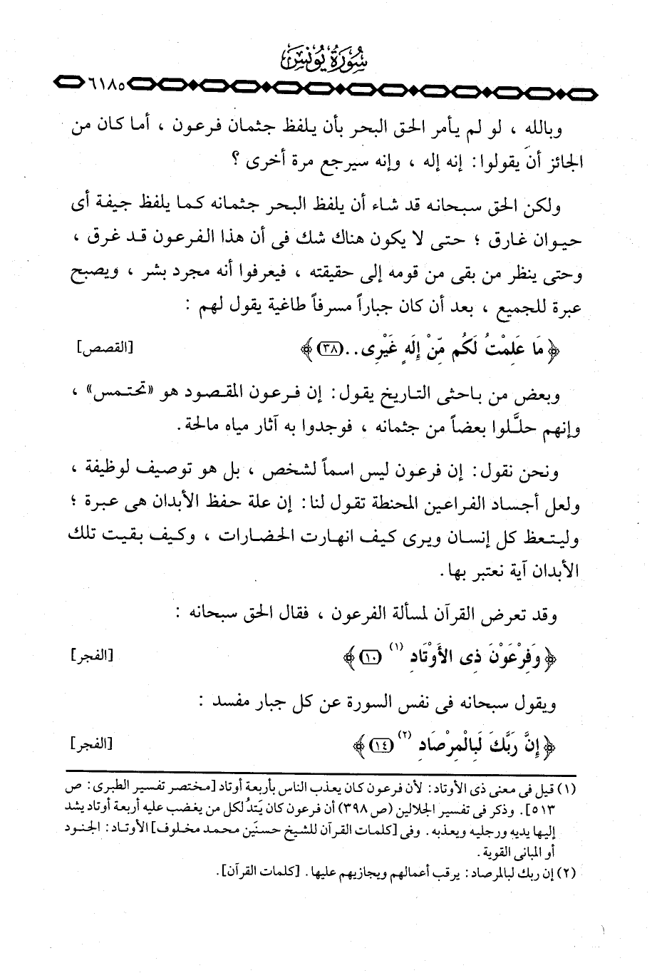 ونحن نقول: إن فرعون ليس اسماً لشخص، بل هو توصيف لوظيفة، ولعل أجساد الفراعين المحنطه تقول لنا: إن علة حفظ الأبدان هي عبرة؛ وليتعظ كل إنسان ويرى كيف انهارت الحضارات، وكيف بقيت تلك الأبدان آية نعتبر بها.