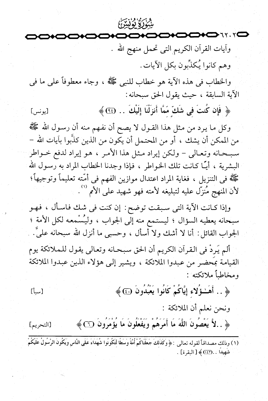 وكل ما يريد من مثل هذا القول لا يصح أن نفهم منه أن رسول الله صَلَّى اللَّهُ عَلَيْهِ وَسَلَّم َ من الممكن أن يشك، أو من المحتمل أن يكون من الذين كذَّبوا بآيات الله سبحانه وتعالى ولكن إيراد مثل هذا الأمر، هو إيراد لدفع خواطر البشرية، أيًا كانت تلك الخواطر، فإذا وجدنا الخطاب المراد به رسول الله صَلَّى اللَّهُ عَلَيْهِ وَسَلَّم َ في التنزيل، فغاية المراد اعتدال موازين الفهم في أمّته تعليماً وتوجيهاً؛ لأن المنهج مُنزّل عليه لتبليغه لأمته فهو شهيد على الأمم.