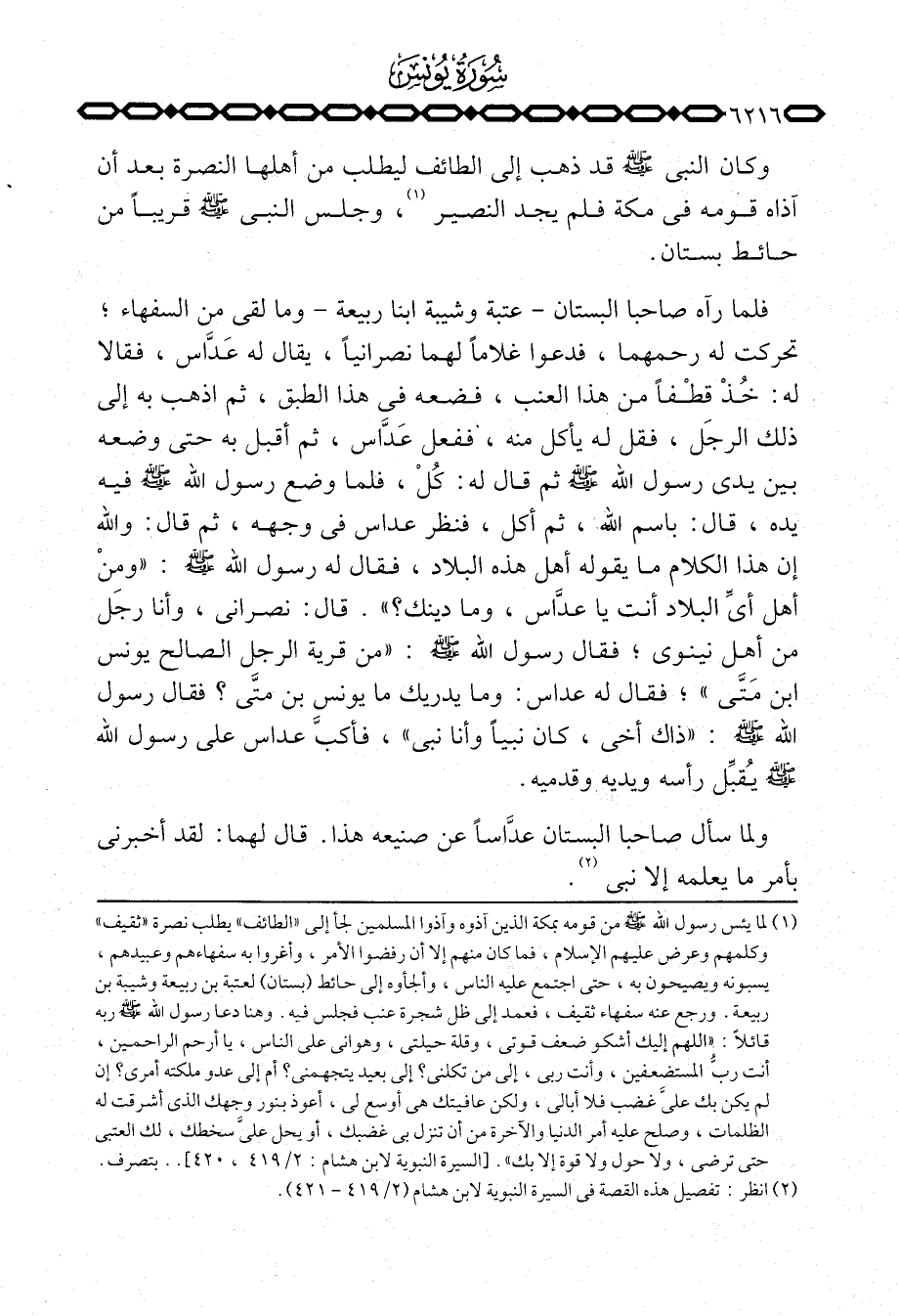 فلما رآه صاحبا البستان عتبة وشيبة ابنا ربيعة وما لقي من السفهاء؛ تحركت له رحمهما، فدعوا غلاماً لهما نصرانياً، يقال له عَدَّاس، فقالا له: خُذْ قِطْفاً من هذا العنب، فضعه في هذا الطبق، ثم اذهب به إلى ذلك الرجل، فقل له يأكل منه، ففعل عَدَّاس، ثم أقبل به حتى وضعه بين يدي رسول الله صَلَّى اللَّهُ عَلَيْهِ وَسَلَّم َ ثم قال له: كُلْ، فلما وضع رسول الله صَلَّى اللَّهُ عَلَيْهِ وَسَلَّم َ فيه يده، قال: باسم الله، ثم أكل، فنظر عداس في وجهه، ثم قال: والله إن هذا الكلام ما يقوله أهل هذه البلاد، فقال له رسول الله صَلَّى اللَّهُ عَلَيْهِ وَسَلَّم َ:» ومنْ أهل أيِّ البلاد أنت يا عدَّاس، وما دينك؟ «. قال: نصراني، وأنا رجل من أهل نينوى؛ فقال رسول الله صَلَّى اللَّهُ عَلَيْهِ وَسَلَّم َ:» من قرية الرجل الصالح يونس بن مَتَّى «؛ فقال له عداس: وما يدريك ما يونس بن متَّى؟ فقال رسول الله صَلَّى اللَّهُ عَلَيْهِ وَسَلَّم َ:» ذاك أخي كان نبياً وأنا نبي «، فأكبَّ عداس على رسول الله صَلَّى اللَّهُ عَلَيْهِ وَسَلَّم َ يُقبِّل رأسه ويديه وقدميه.
