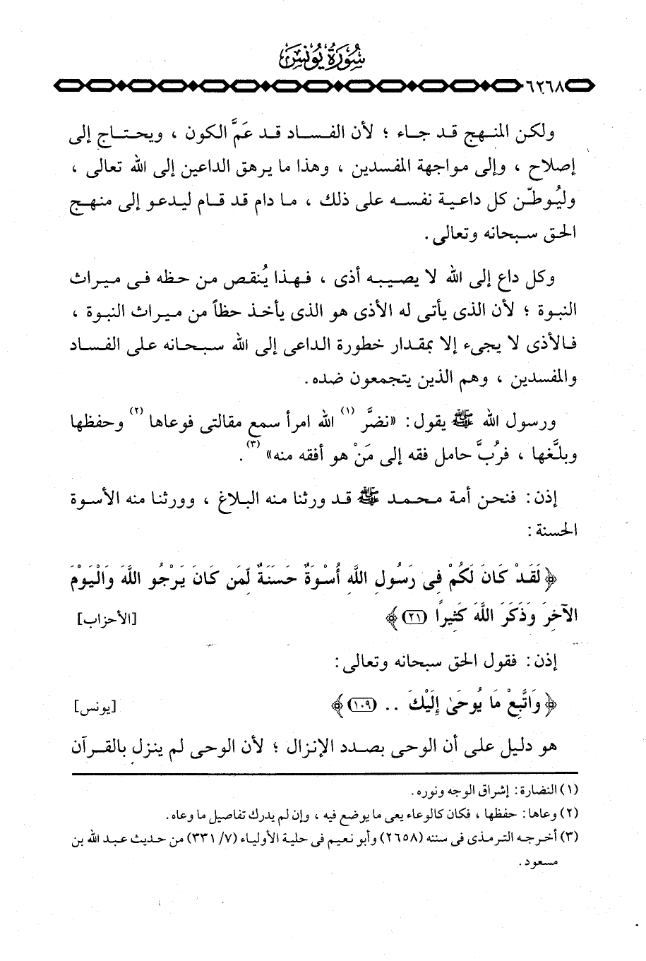 ورسول الله صَلَّى اللَّهُ عَلَيْهِ وَسَلَّم َ يقول: «نضَّر الله امرأ سمع مقالتي فوعاها وحفظها وبلَّغها، فرُبَّ حامل فقه إلى مَنْ هو أفقه منه» .