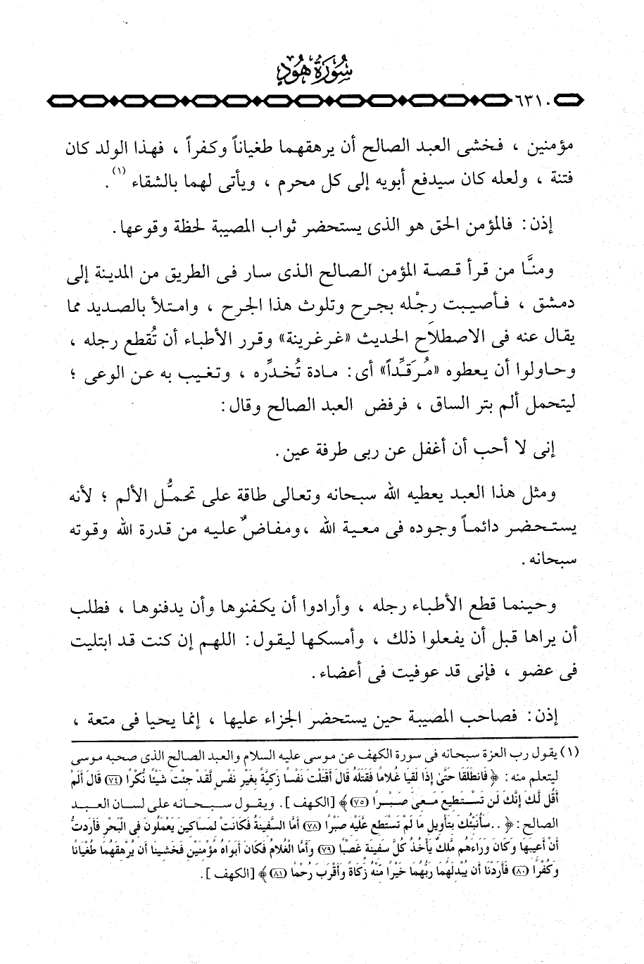 ومنَّا من قرأ قصة المؤمن الصالح الذي سار في الطريق من المدينة إلى دمشق، فأصيبت رِجْله بجرح وتلوث هذا الجرح، وامتلأ بالصديد مما يقال عنه في الاصطلاح الحديث «غرغرينة» وقرر الأطباء أن تٌقطع رجله، وحاولوا أن يعطوه «مُرَقِّداً» أي: مادة تُخدِّره، وتغيب به عن الوعي؛ ليتحمل ألم بتر الساق، فرفض العبد الصالح وقال: