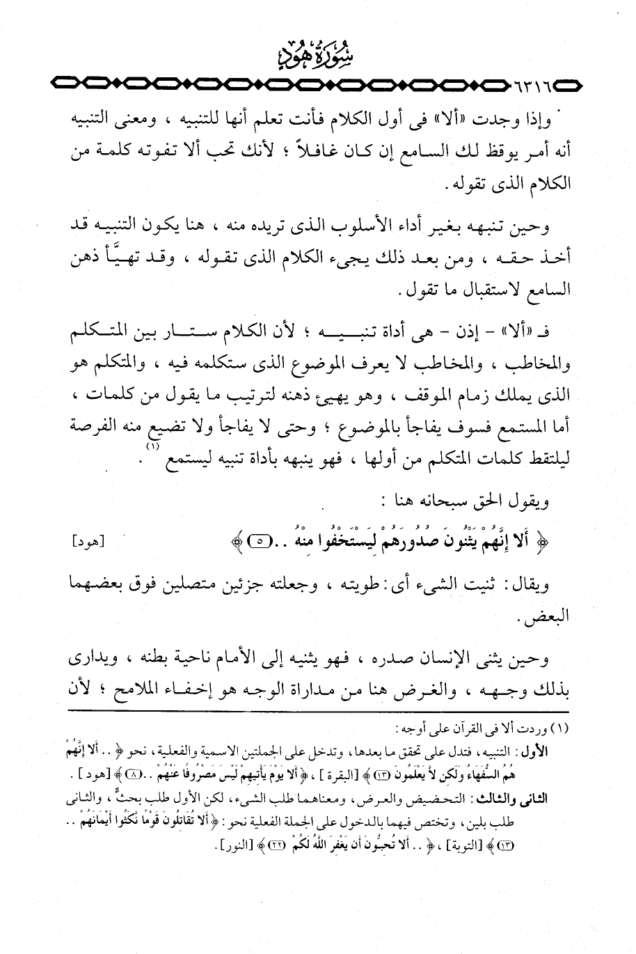 ف «ألا» إذن هي أداة تنبيه؛ لأن الكلام ستار بين المتكلم والمخاطب، والمخاطب لا يعرف الموضوع الذي ستكلمه فيه، والمتكلم هو الذي يملك زمام الموقف، وهو يهيىء ذهنه لترتيب ما يقول من كلمات، أما المستمع فسوف يفاجأ بالموضوع؛ وحتى لا يفاجأ ولا تضيع منه الفرصة ليلتقط كلمات المتكلم من أولها، فهو ينبه بأداة تنبيه ليستمع.